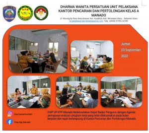 Jumat, 23 September 2022 DWP UP KPP Manado Melaksanakan rapat badan pengurus dengan agenda pemaparan evaluasi program kerja yang telah dilaksanakan pada bulan berjalan dan rapat berlangsung di Kantor Pencarian dan Pertolongan Manado