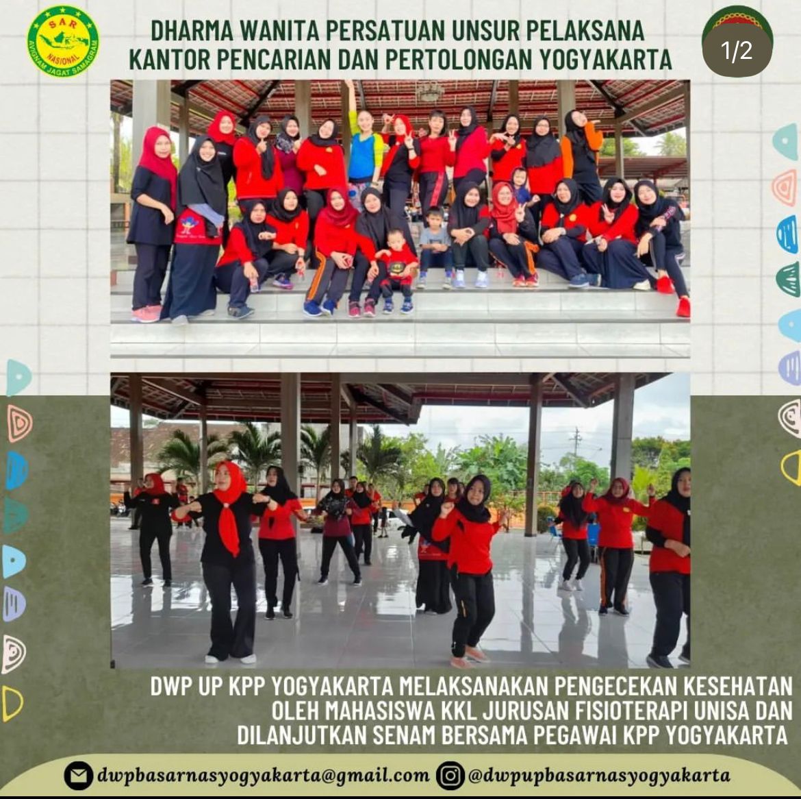 Jumat, 21 Oktober 2022 DWP Up Kantor Pencarian dan Pertolongan Yogyakarta Melaksanakan Pengecekan Kesehatan oleh Mahasiswa KKL Jurusan Fisioterapi UNISA dilanjut Senam Bersama dengan Pegawai Kantor Pencarian dan Pertolongan Yogyakarta