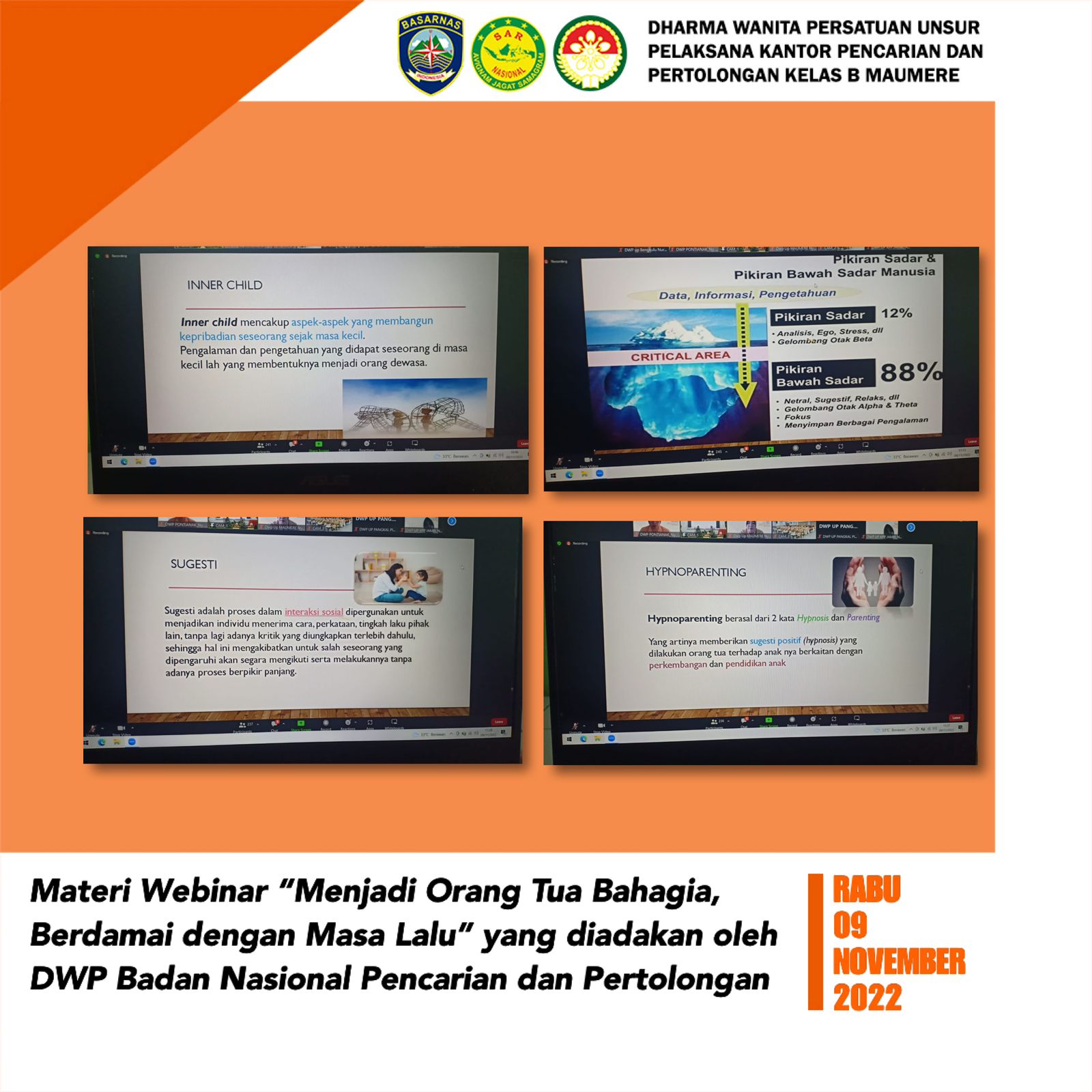 Rabu, 9 November 2022. Ketua DWP Kantor Pencarian dan Pertolongan Maumere Ny.Yuli Wahyu Efendi bersama Anggota (DWP UP Kantor SAR Maumere, Pos SAR Manggarai Barat, & Unit Siaga SAR Ende) mengikuti Webinar “Menjadi Orang Tua Bahagia, Berdamai dengan Masa Lalu” yang diadakan oleh DWP Badan Nasional Pencarian dan Pertolongan