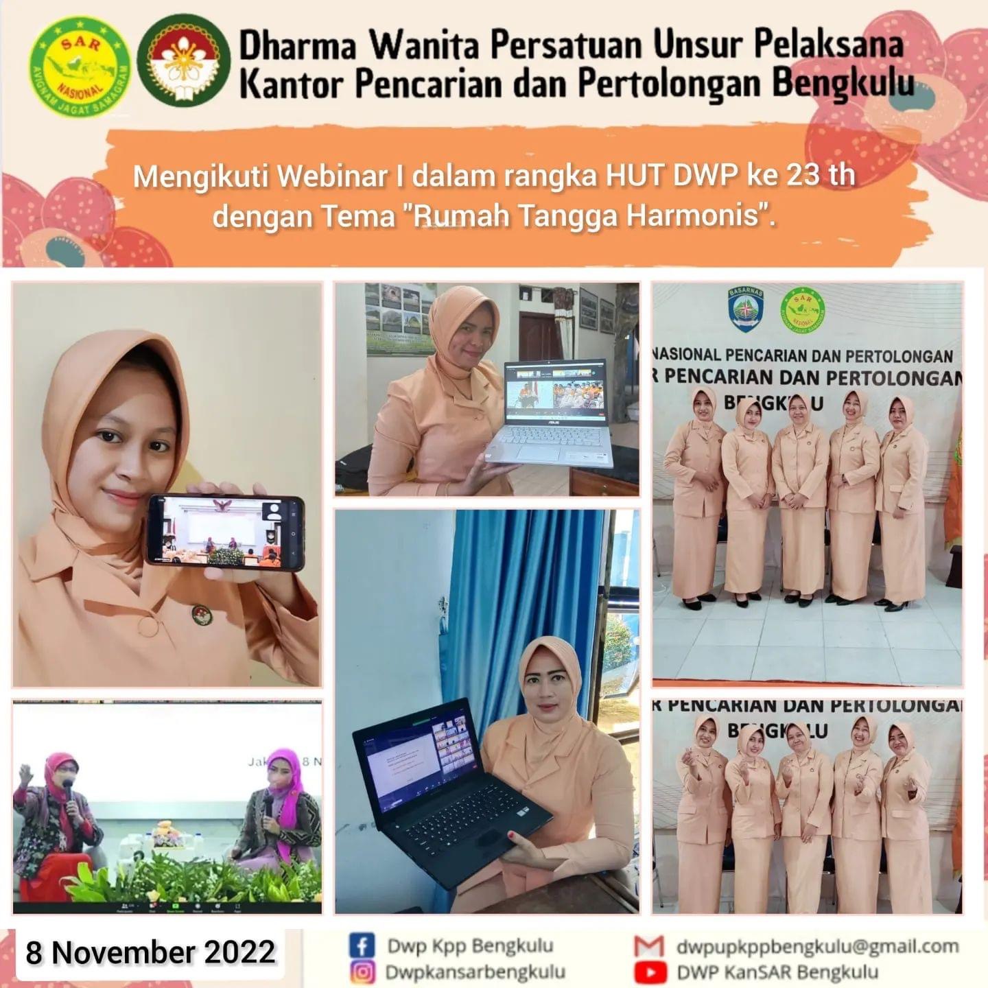 Selasa, 8 November 2022 Penasehat DWP beserta pegawai dan Pengurus beserta anggota mengikuti Webinar I dalam rangka HUT DWP ke 23 tahun yang di selenggarakan oleh DWP Basarnas Pusat. Dengan Tema " Rumah Tangga Harmonis" narasumber dr. Dewi Inong irama, Sp. KK Moderator dr. Laely Yunia Sari, Sp. B(K) BD. Mkes.