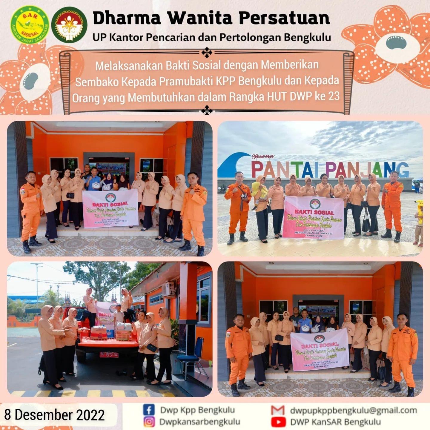 Giat DWP UP KPP Bengkulu Kamis, 8 Desember 2022 Melaksanakan Bakti Sosial dengan Membagikan Sembako kepada Pramubakti KPP Bengkulu dan kepada masyarakat yang membutuhkan dalam Rangka HUT DWP ke 23 th.
