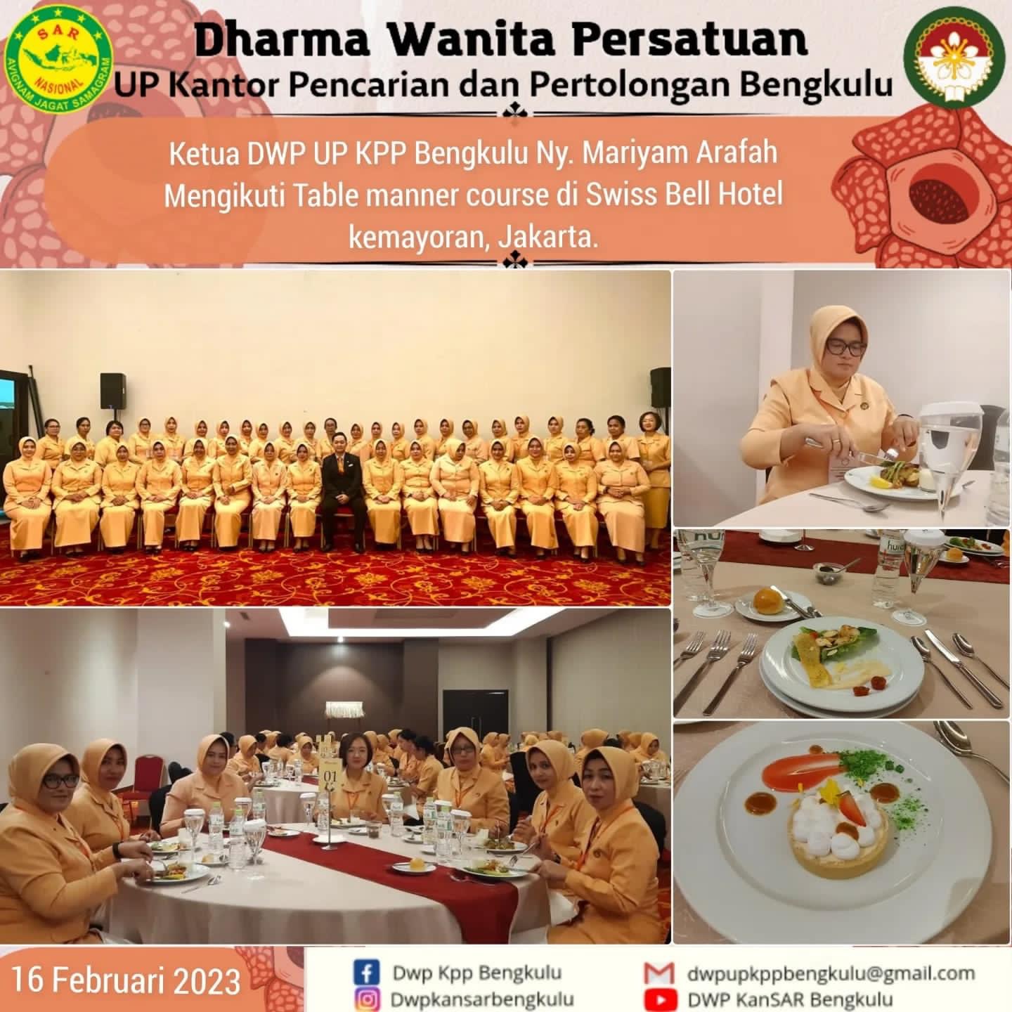 Kamis, 16 Februari Ketua DWP UP KPP Bengkulu Ny. Mariyam Arafah Mengikuti rangkaian kegiatan Hari ke Tiga Rapat Kerja DWP Basarnas Tahun 2023, Yaitu: 1. Table manner course di Swiss Bell Hotel kemayoran Jakarta 2. Ceramah tentang Etika Pergaulan dan Berbicara di Ruang Rapat lantai 2 Gedung Basarnas Jakarta. 3. Penutupan Rapat Kerja DWP Basarnas Tahun 2023 di Ruang Rapat lantai 2 Gedung Basarnas,