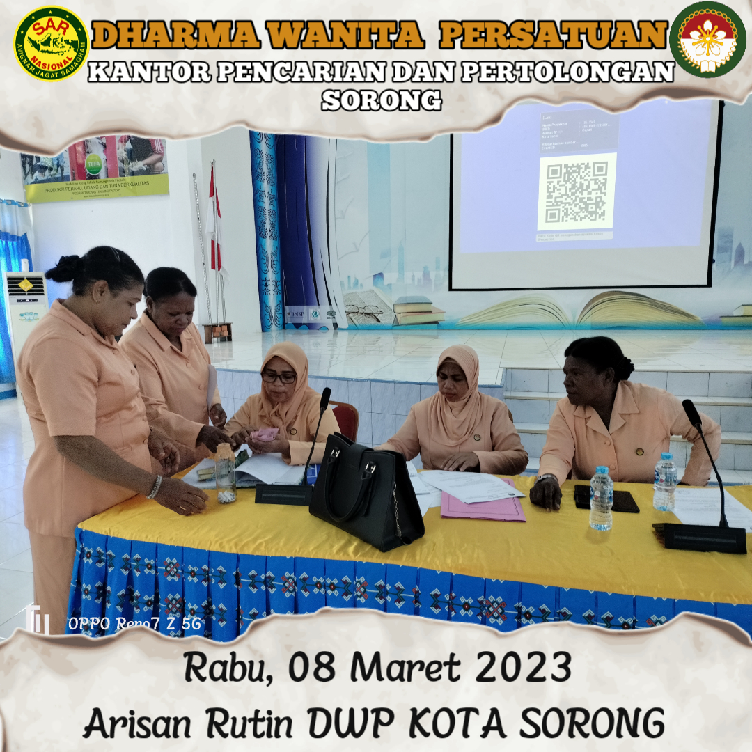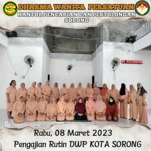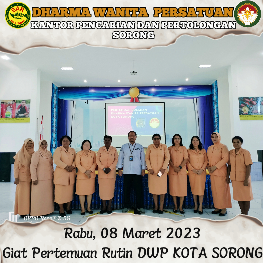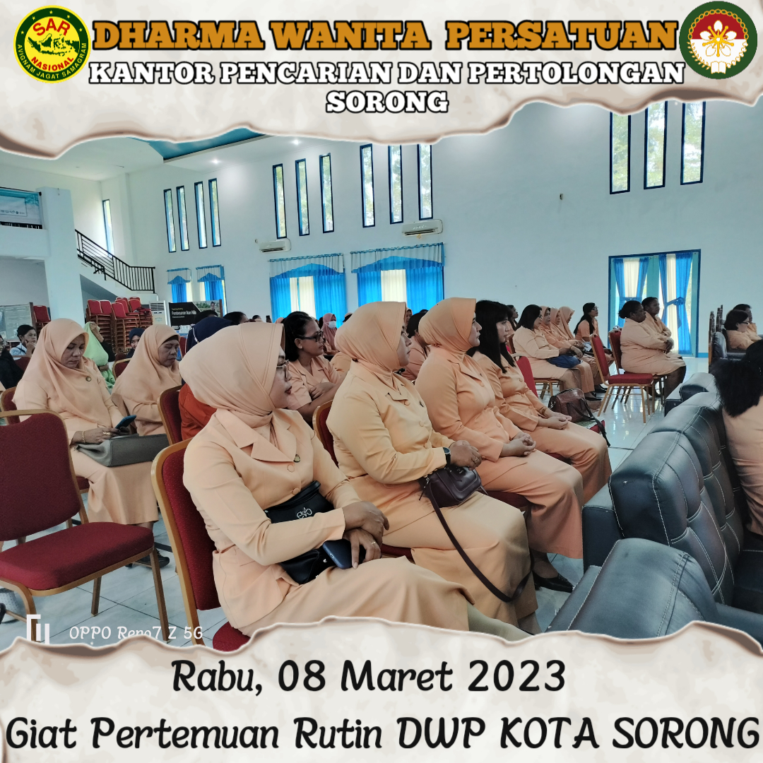 Rabu,08 Maret 2023 Ketua DWP UP KPP Sorong Ny Yenny Amiruddin di dampingi Wakil Ketua Ny. Rosna Muslikun serta bersama 2 pengurus menghadiri Pertemuan Rutin Bulanan DWP Kota Sorong yang bertempat di Aula Politeknik Kelautan dan Perikanan. Kegiatan Berisi Pengajian Rutin, Pengenalan BPJS Ketenagakerjaan dan Arisan.