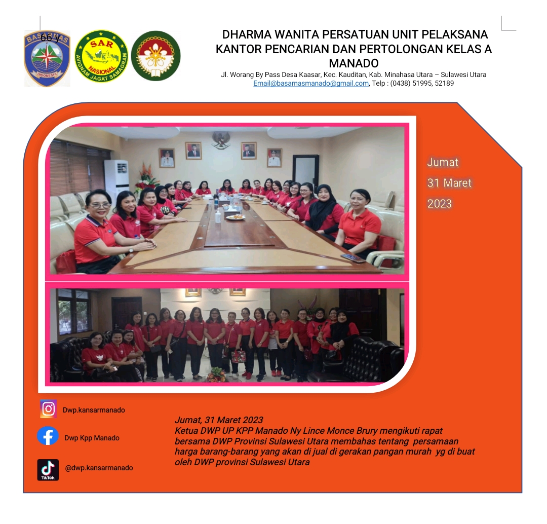 Jumat, 31 Maret 2023 Ketua DWP UP KPP Manado Ny Lince Monce Brury mengikuti rapat bersama DWP Provinsi Sulawesi Utara membahas tentang persamaan harga barang-barang yang akan di jual di gerakan pangan murah yg di buat oleh DWP provinsi Sulawesi Utara