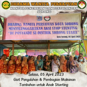 Selasa, 05 April 2023 Wakil Ketua DWP UP KPP Sorong, Ny Rosna Muslikun bersama Sekretaris (Ny.Indri Bambang) & Ketua Bid.Ekonomi(Ny.Irma Amhry) menghadiri Giat DWP KOTA SORONG yaitu "Aksi Stop Stunting" Di isi dengan Penyuluhan tentang Stunting serta Pembagian Makanan Tambahan berupa (Telur, Susu, kacang Hijau, Gula) untuk anak-anak yang terkena Stunting.Bertempat di Kantor Distrik Sorong Utara.