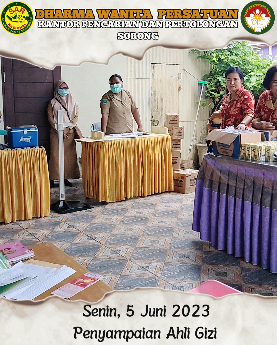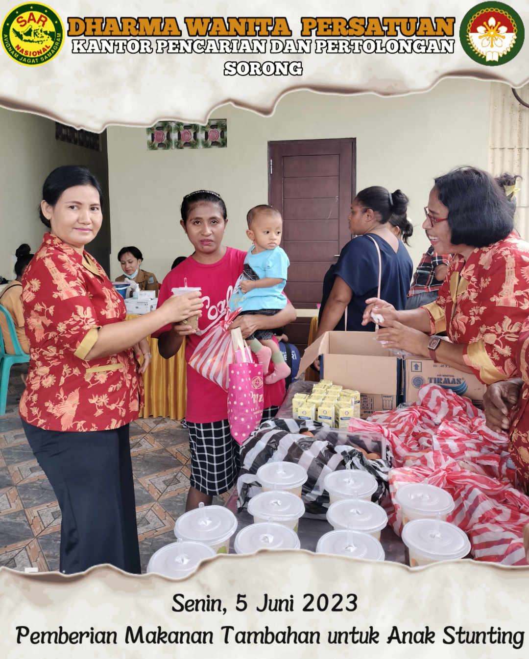 Senin, 5 Juni 2023 DWP UP Kantor Pencarian dan Pertolongan Sorong Ny. Indri Bambang selaku Sekretaris mengikuti Giat Stunting Bersama Dharma Wanita Persatuan Kota Sorong, yaitu Tinjau Anak Stunting dan Pemberian makanan tambahan berupa Bubur kacang Hijau, Telur dan Susu UHT kepada anak-anak usia 1-5tahun. Kegiatan bertempat di Posyandu Bersama Rawa Indah Sorong.