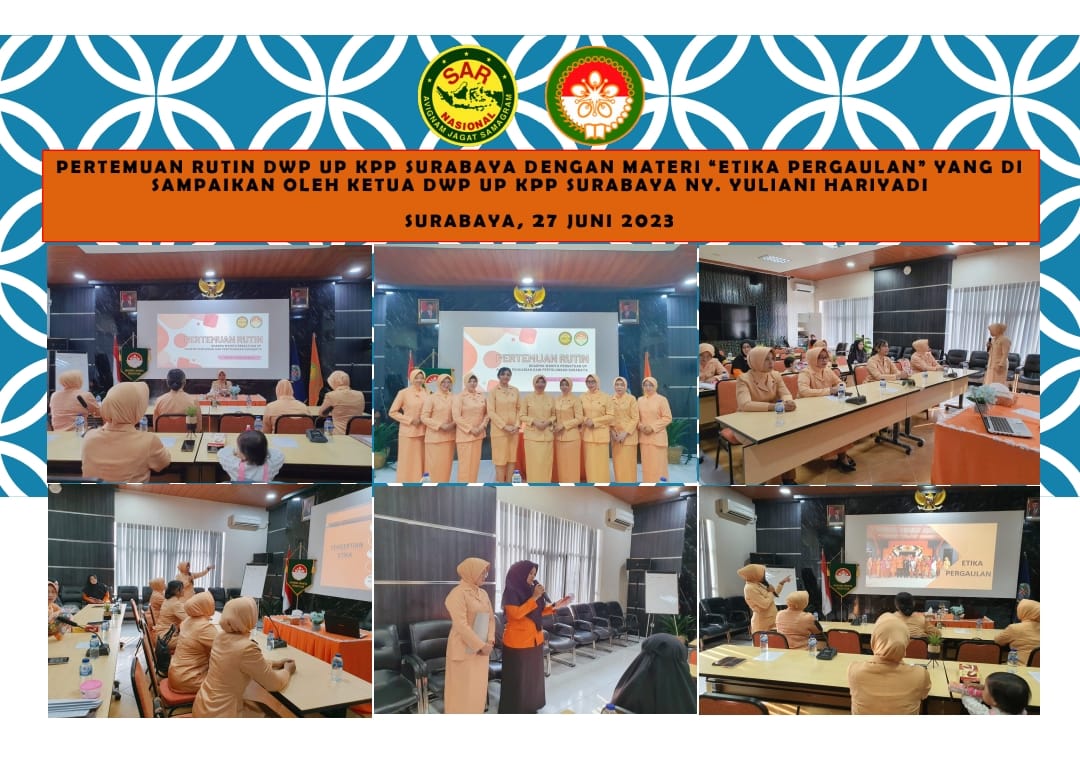 DWP UP KPP Surabaya melaksanakan pertemuan rutin dengan materi "Etika Pergaulan" yang disampaikan oleh Ketua DWP UP KPP Surabaya Ny. Yuliani Hariyadi bertempat dilantai 2 ruang Briefing Kantor Pencarian dan Pertolongan Surabaya.