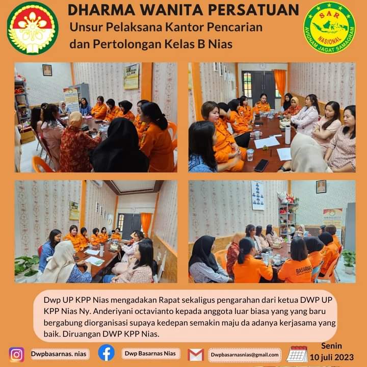 Senin, 10 Juli 2023 DWP UP KPP Nias mengadakan rapat sekaligus pengarahan dari ibu kks Ny. Anderiyani octavianto kepada anggota luar biasa yang baru bergabung di organisasi supaya kedepan semakin maju dan terjalin kerjasama yang baik, di ruangan DWP KPP Nias.