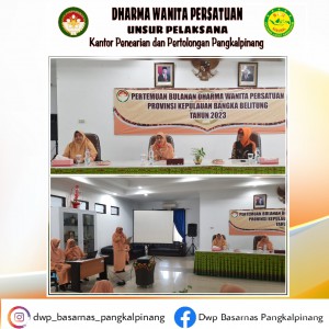 Kamis, 13 Juli 2023 Dharma Wanita Persatuan Unsur Pelaksana Kantor Pencarian dan Pertolongan Pangkalpinang menghadiri Pertemuan Rutin Bulanan DWP Provinsi Kep. Bangka Belitung yang diisi dengan Sosialisasi oleh DWP Dinas Kesehatan dengan tema " Kiat - Kiat Praktis Pemantauan Pertumbuhan dan Perkembangan Bayi dan Balita Terkait Upaya Pencegahan Stanting Sejak Dini "