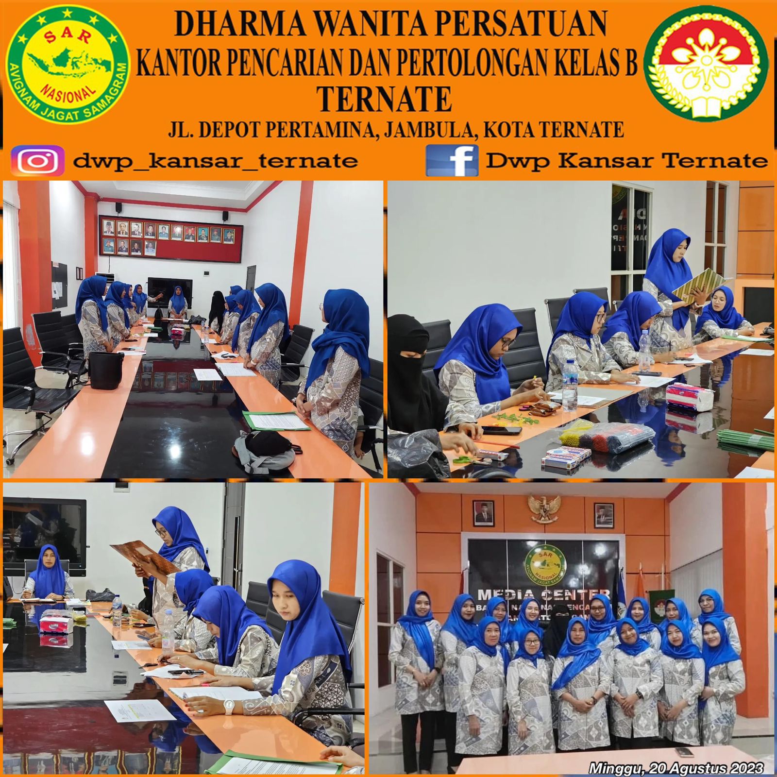 Minggu, 20 Agustus 2023 DWP UP. Kantor Pencarian dan Pertolongan Ternate melaksanakan pertemuan rutin bulanan Bulan Agustus, bertempat di Lantai 1 Gedung Serbaguna Kantor SAR Ternate. Diikuti oleh 15 orang anggota.