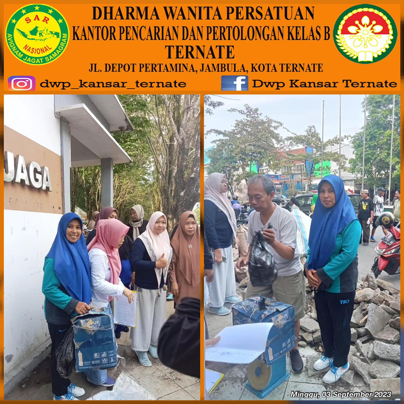 Minggu, 03 September 2023 DWP UP. Kantor Pencarian dan Pertolongan Ternate yang mana diwakili oleh Ibu Armawati Halidin mengikuti kegiatan penimbangan Bank Sampah yang dilaksanakan oleh DWP Kota Ternate bertempat di Taman Nukila Kota Ternate.