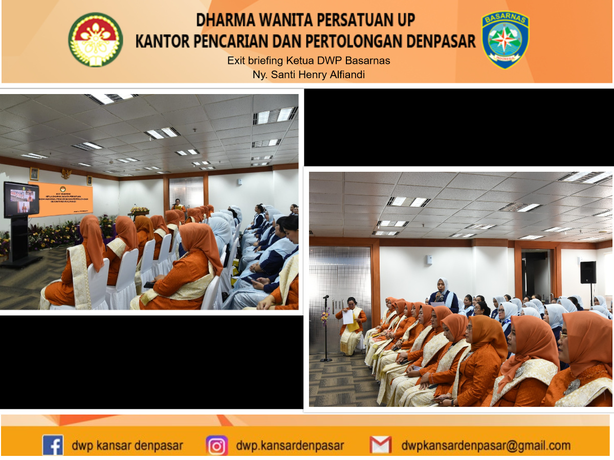 Pada hari Rabu, 4 Oktober 2023 dilaksanakan exit briefing Ketua DWP Basarnas Ny. Santi Henry Alfiandy bertempat di Gedung Basarnas. Diikuti oleh semua pengurus DWP Pusat dan Ketua UP