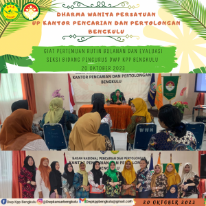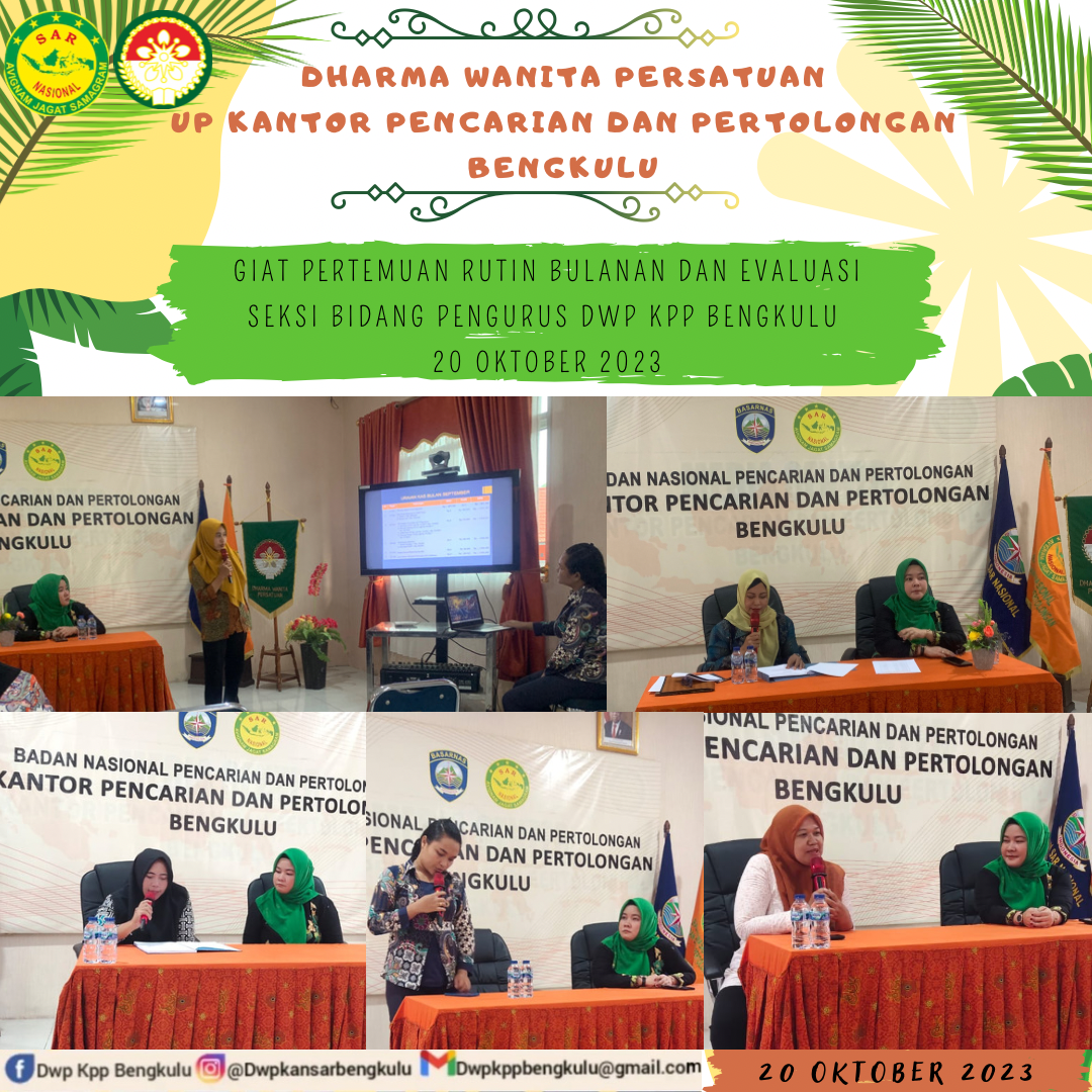 Dharma wanita persatuan unsur pelaksana kantor pencarian dan pertolongan Bengkulu yang dipimpin Ibu Ketua Ny. Rosna Oviana Muslikun Melaksanakan Giat Pertemuan Rutin bulanan dan Evaluasi Seksi Bidang Pengurus DWP KPP Bengkulu 20 Oktober 2023 yang bertempat di Aula Kantor Pencarian dan Pertolongan Bengkulu