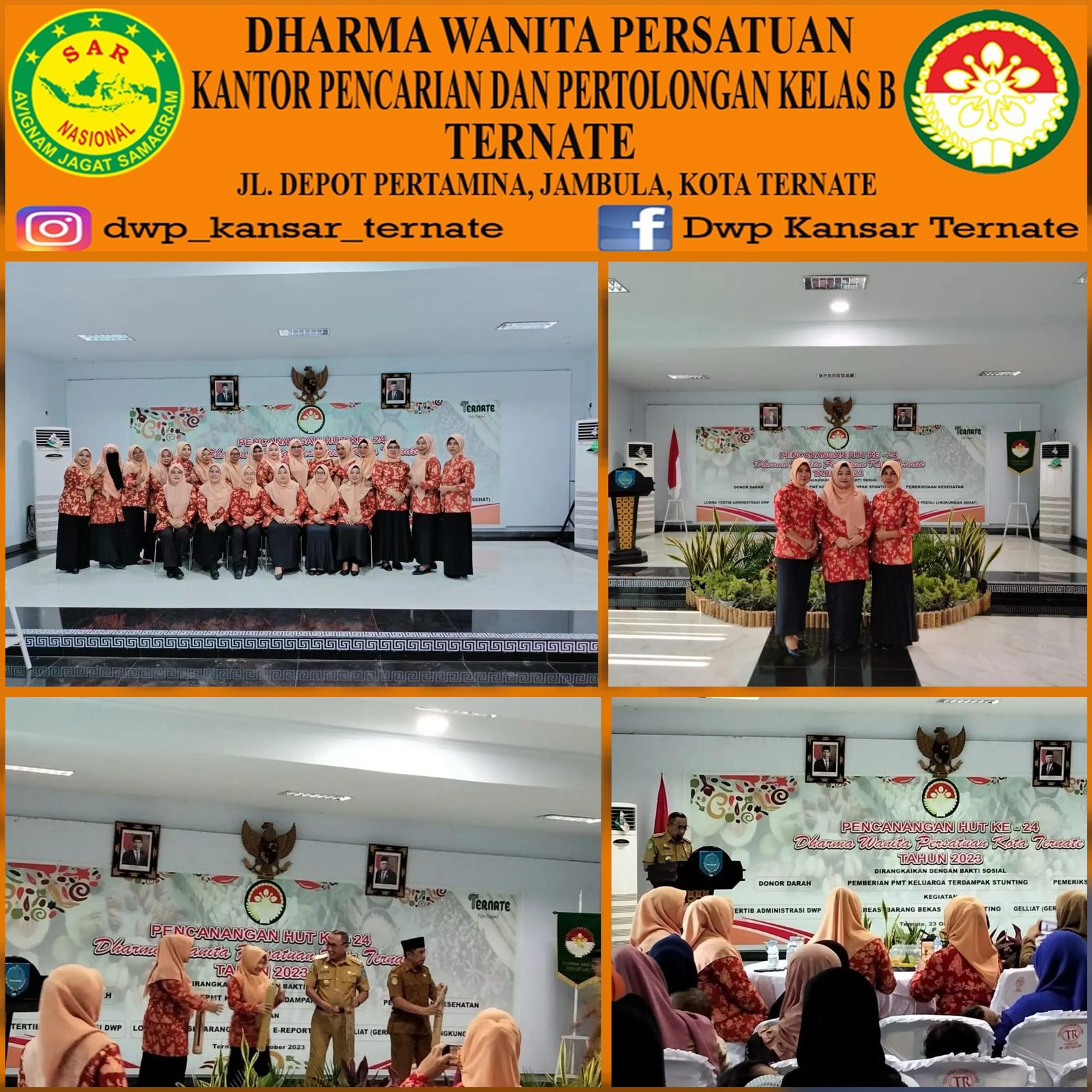 Senin, 23 Oktober 2023 DWP UP. Kantor Pencarian dan Pertolongan Ternate mengikuti Kegiatan Pencanangan Hari Ulang Tahun Dharma Wanita Persatuan Ke 24 Tahun 2023 yang diikuti oleh 2 Orang Anggota, bertempat di Aula Kantor Walikota Ternate.