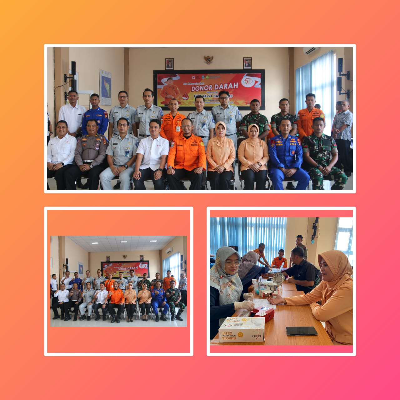 DWP UP Kantor Pencarian dan Pertolongan Banda Aceh mengikuti acara donor darah , yang dilaksanakan oleh Kantor Pencarian dan Pertolongan Banda Aceh, di ruang aula Kantor pencarian dan Pertolongan Banda Aceh