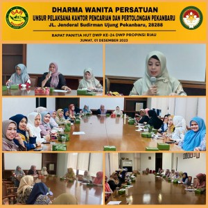 Jumat, 01 Desember 2023. Ketua DWP UP KPP Pekanbaru, Ny. Siska Budi Cahyadi mengikuti rapat panitia HUT DWP ke-24 dalam hal tersebut membahas persiapan panitia dalam rangkaian kegiatan lomba yang di adakan oleh DWP Provinsi Riau. Bertempat di Gedung Wanita Pekanbaru