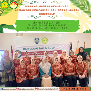 Kamis, 7 Desember 2023 Ketua, Pengurus beserta Anggota Dharma Wanita Persatuan Unsur Pelaksana Kantor Pencarian dan Pertolongan Bengkulu melaksanakan seminar dengan Tema “ Pendidikan Dalam Keluarga “ yang disampaikan oleh Ibu Desi Susanti S.Pd bertempat di Aula Kantor Pencarian dan Pertolongan Bengkulu
