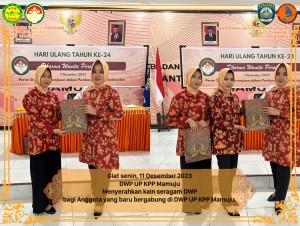 Senin, 11/12 / 2023 Ketua Dharma Wanita Persatuan UP KPP Mamuju Ny. Erwina Rizal menyerahkan kain seragam DWP kepada Ny. Nita Alfi dan Ny. Fatima Akmal yang baru bergabung menjadi Anggota DWP UP KPP Mamuju.