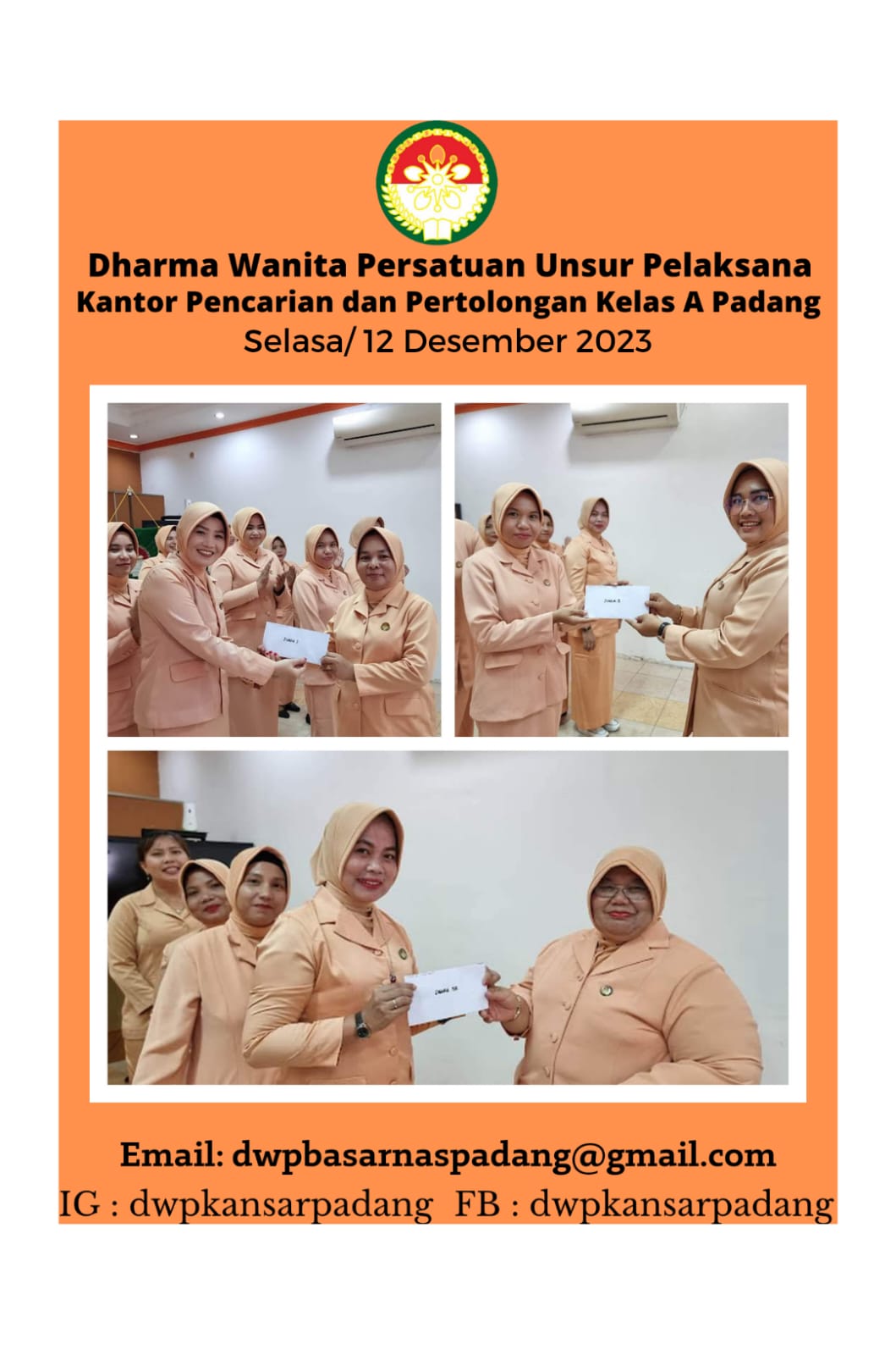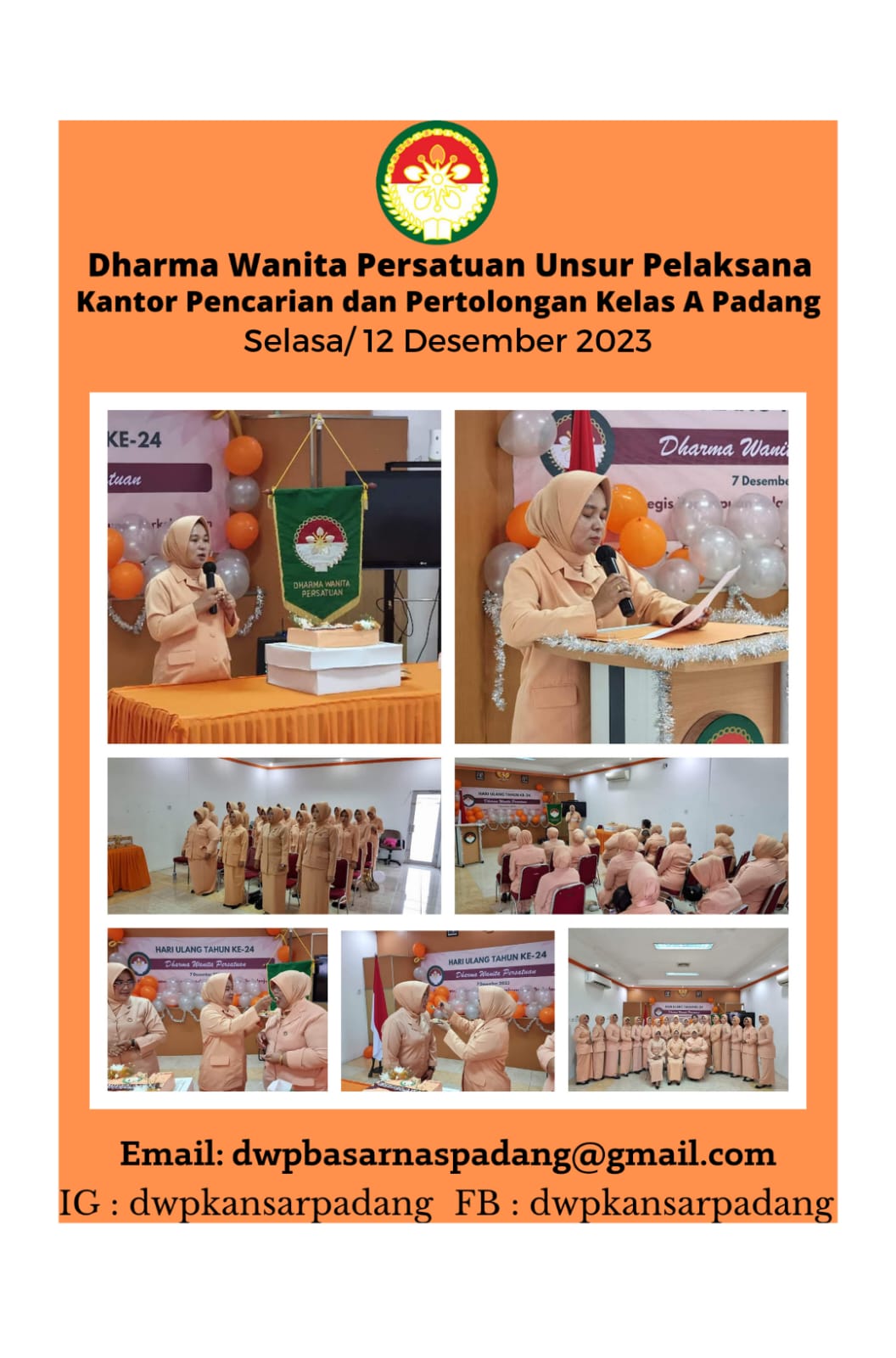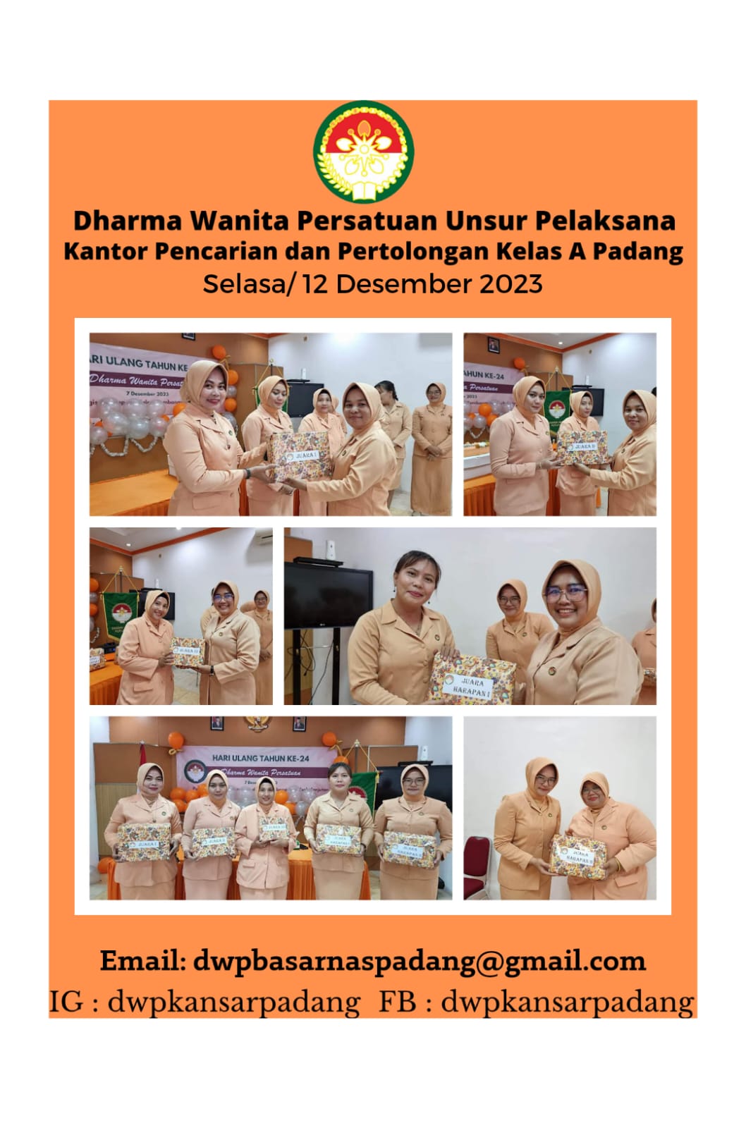 Pada hari Selasa tanggal 12 Desember 2023, Ibu DWP UP KPP Padang beserta pengurus dan anggota mengikuti rangkaian kegiatan puncak perayaan HUT DWP ke 24 sekaligus penyerahan hadiah lomba yang di lakukan dalam rangka memeriahkan HUT DWP ke 24 di Ruangan Pertemuan DWP UP KPP Padang