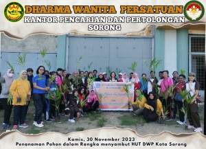 Pada Hari Kamis, 30 November Wakil Ketua Ny. Ula Hendry bersama beberapa Anggota mengikuti Giat yang di adakan DWP KOTA SORONG Yaitu Menanam Pohon dan Senam bersama Dalam Rangka Menyambut Hari Ulang Tahun DWP ke 24tahun serta Pembagian Bunga dalam Rangka Aksi Stop Kekerasan pada Wanita dan Anak. Bertempat di Seputaran Jalan Raya Kampung Baru. Anggota yang mengikuti 5orang