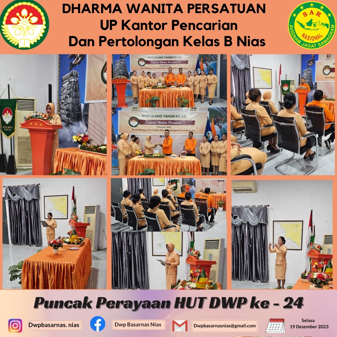 Selasa, 19 Desember 2023 DWP UP KPP Nias merayakan peringatan HUT dan Tasyukuran Dharma wanita Persatuan yang ke - 24 tahun 2023 bertempat di Ruang rapat Kantor pencarian dan pertolongan nias. Dengan Tema "Peran Strategis Perempuan Dalam Pembangunan Berkelanjutan"