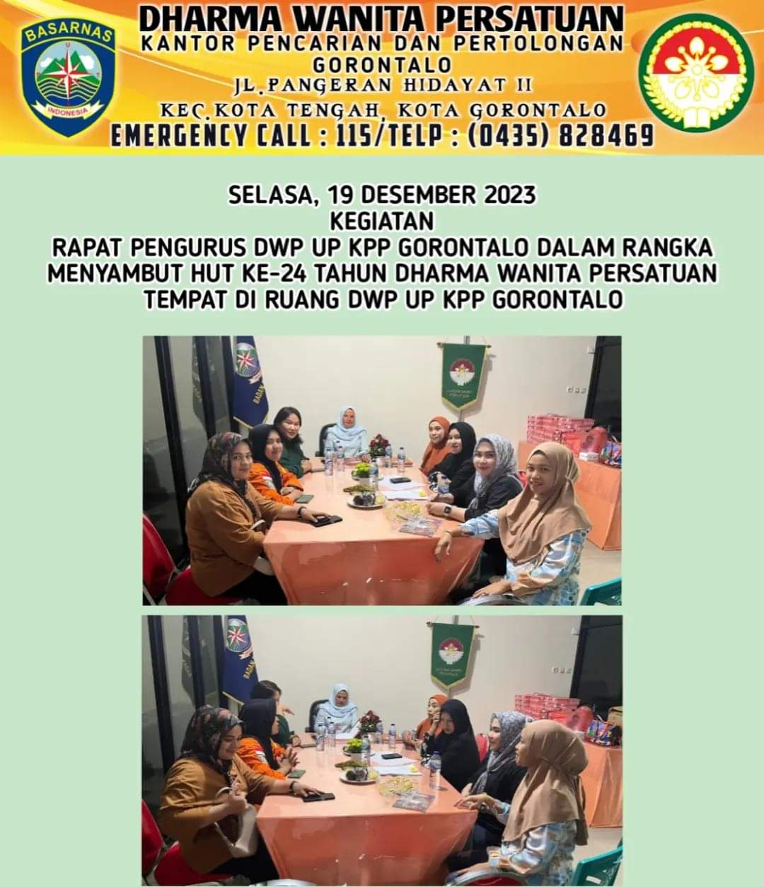 Selasa, 19 Desember 2023 Kegiatan DWP UP KPP (BASARNAS) Gorontalo : Rapat Pengurus Dharma Wanita Persatuan Unsur Pelaksana Kantor Pencarian dan Pertolongan Gorontalo dalam rangka menyambut HUT ke-24 tahun DWP Tempat di ruang DWP UP KPP Gorontalo