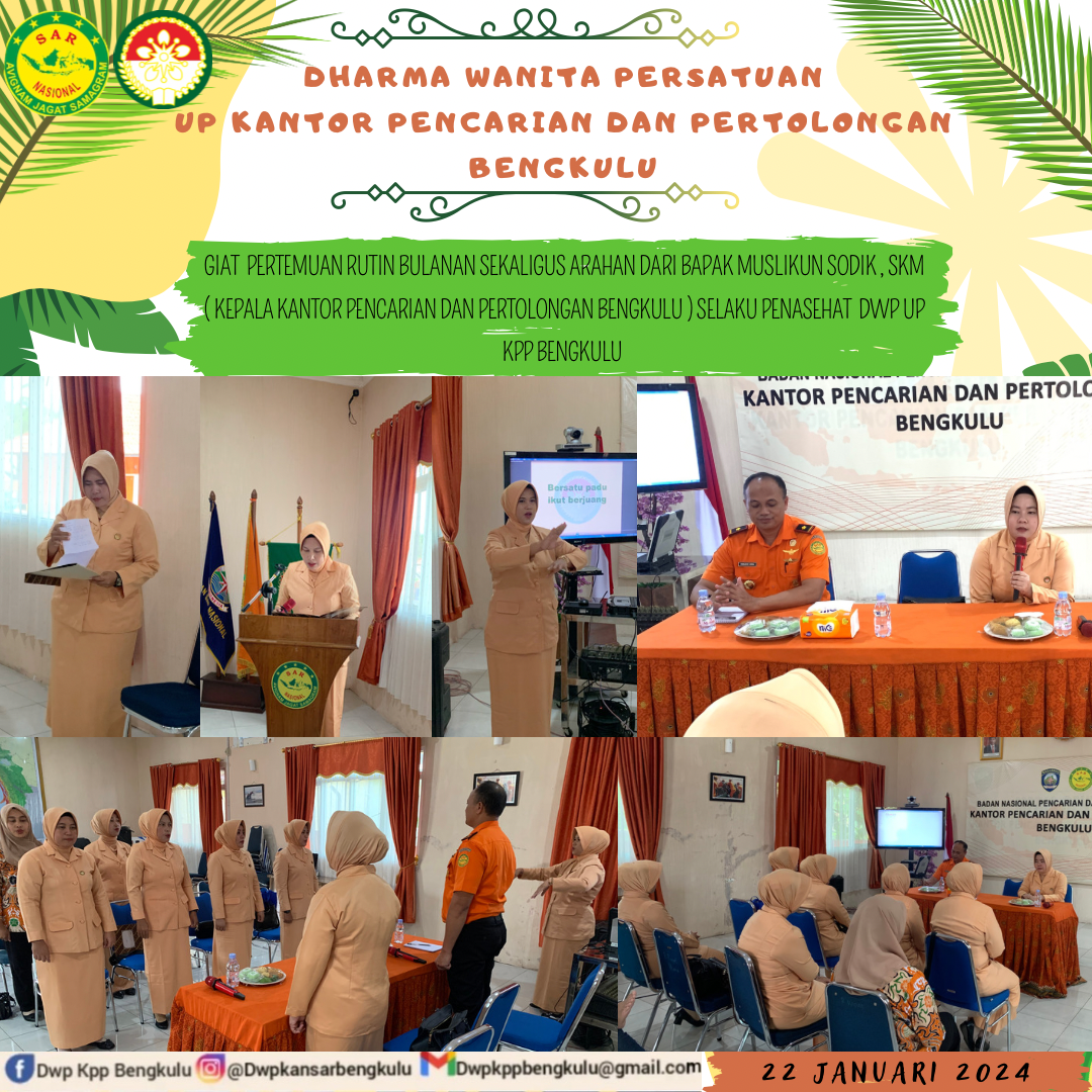 Senin, 22 Januari 2024 Giat Pertemuan Rutin Bulanan sekaligus arahan dari Bapak Muslikun Sodik, SKM (Kepala Kantor Pencarian dan Pertolongan Bengkulu) selaku penasehat DWP UP KPP Bengkulu