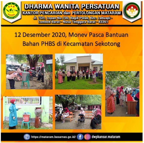 Sabtu, 12 Desember 2020, Posyandu Tawun dan Gili Genting Kecamatan Sekotong, Ketua UP DWP Pencarian dan Pertolongan Mataram bersama 2 orang pengurus DWP Kabupaten Lombok Barat melaksanakan Monitoring dan Evaluasi pasca bantuan bahan PHBS untuk mencegah penularan Covid 19. Kegiatan ini dhajatkan untuk memastikan bahan bantuan bermanfaat dan masih dalam kondisi baik.