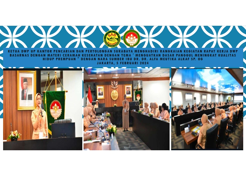 Jakarta 5 Februari 2024 Ketua DWP UP KPP Surabaya Ny. Yuliani Hariyadi menghadiri rangkaian kegiatan rapat kerja DWP Basarnas dengan materi ceramah kesehatan dengan tema "Menguatkan Dasar Panggul Meningkatkan Kualitas Hidup Perempuan " dengan Nara Sumber Ibu Dr. dr. Alfa Meutika Alkaf Sp. OG bertempat di lantai 2 gedung Basarnas di hadiri dan di ikuti oleh pengurus DWP Basarnas dan 44 Ketua DWP UP Basarnas