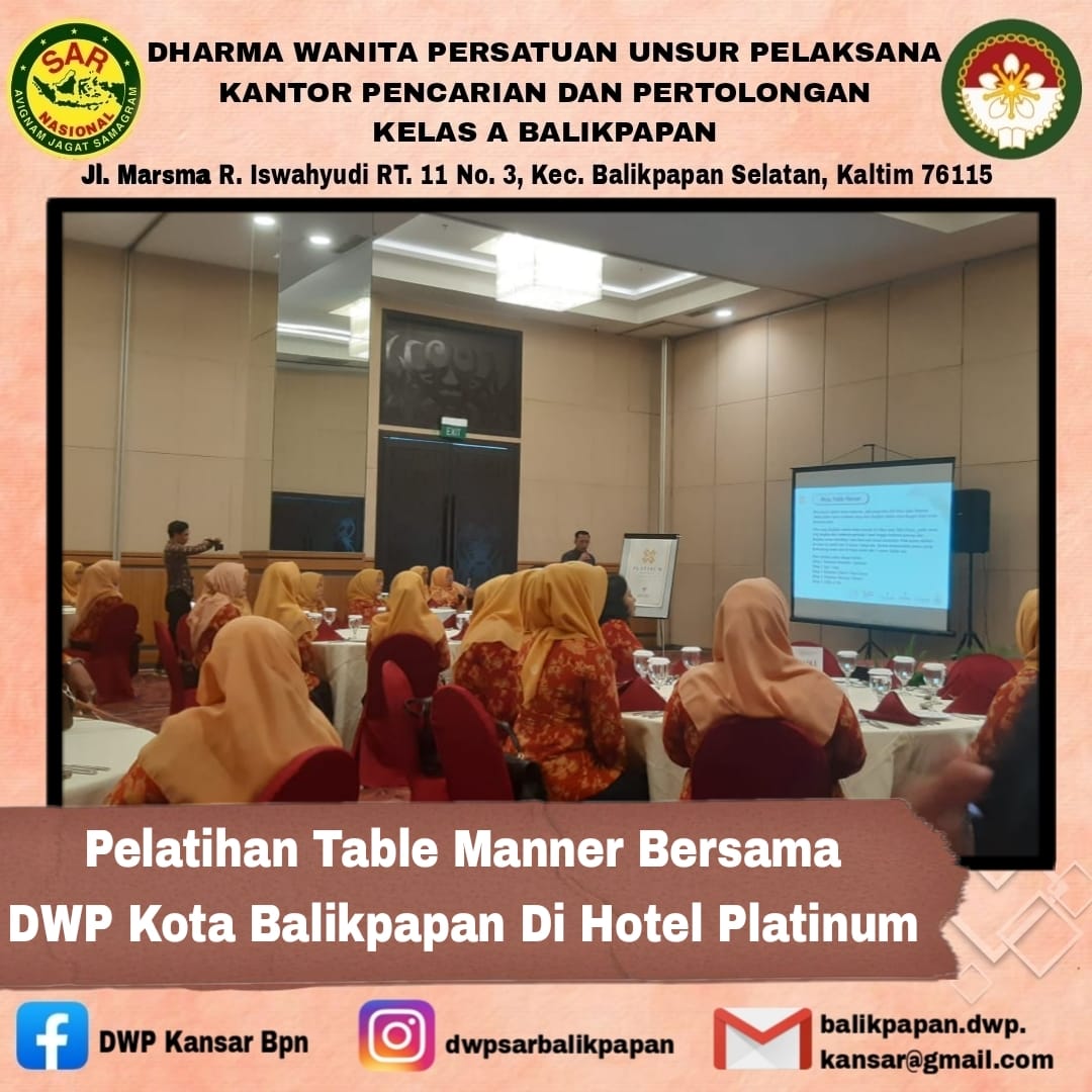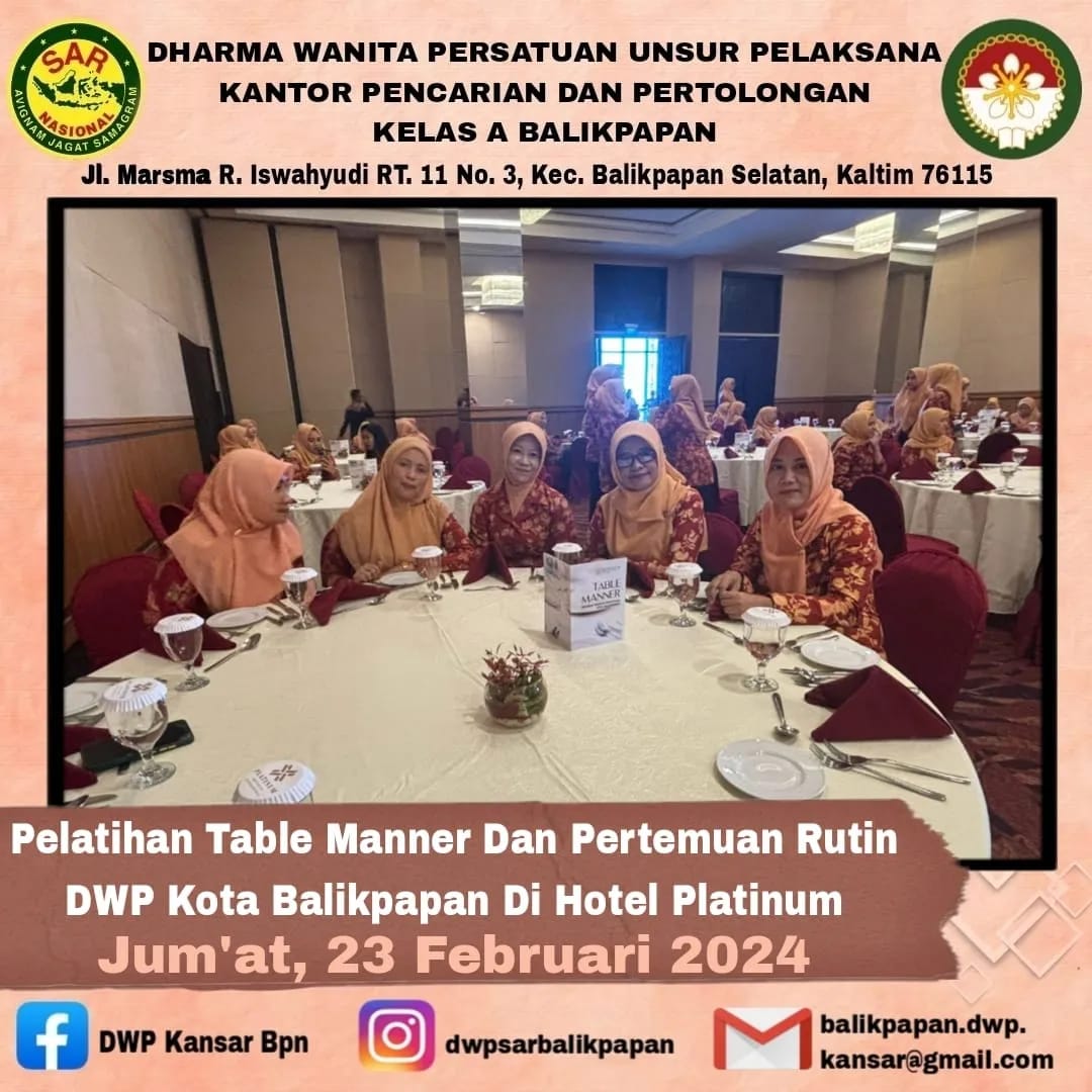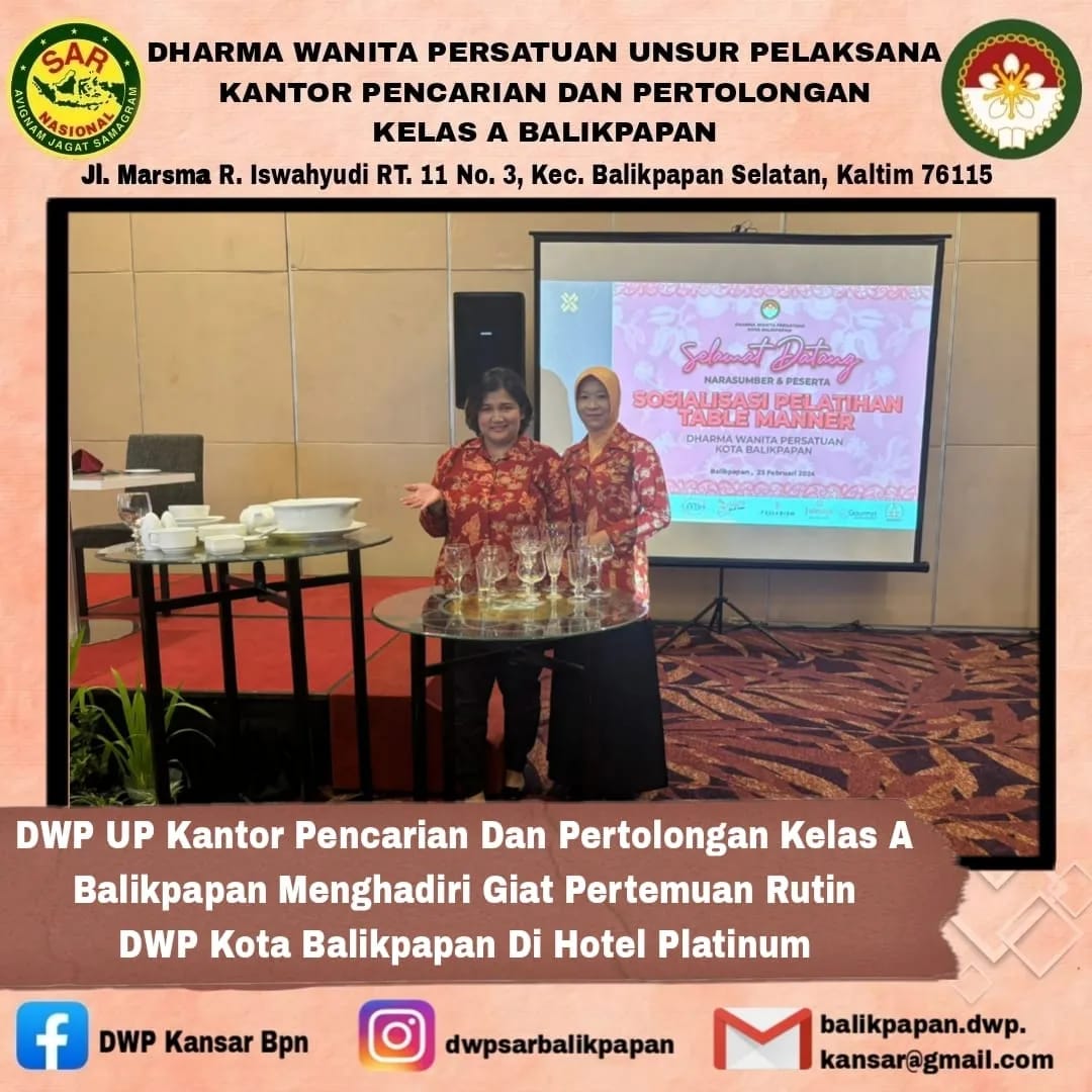 Jumat, 23 Februari 2024 DWP Unsur Pelaksana Kantor Pencarian dan Pertolongan Balikpapan menghadiri pertemuan rutin dengan DWP Kota Balikpapan yang diisi dengan kegiatan Table Manner di Hotel Platinum Balikpapan