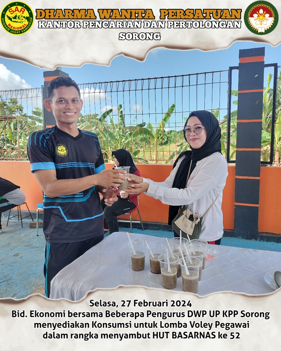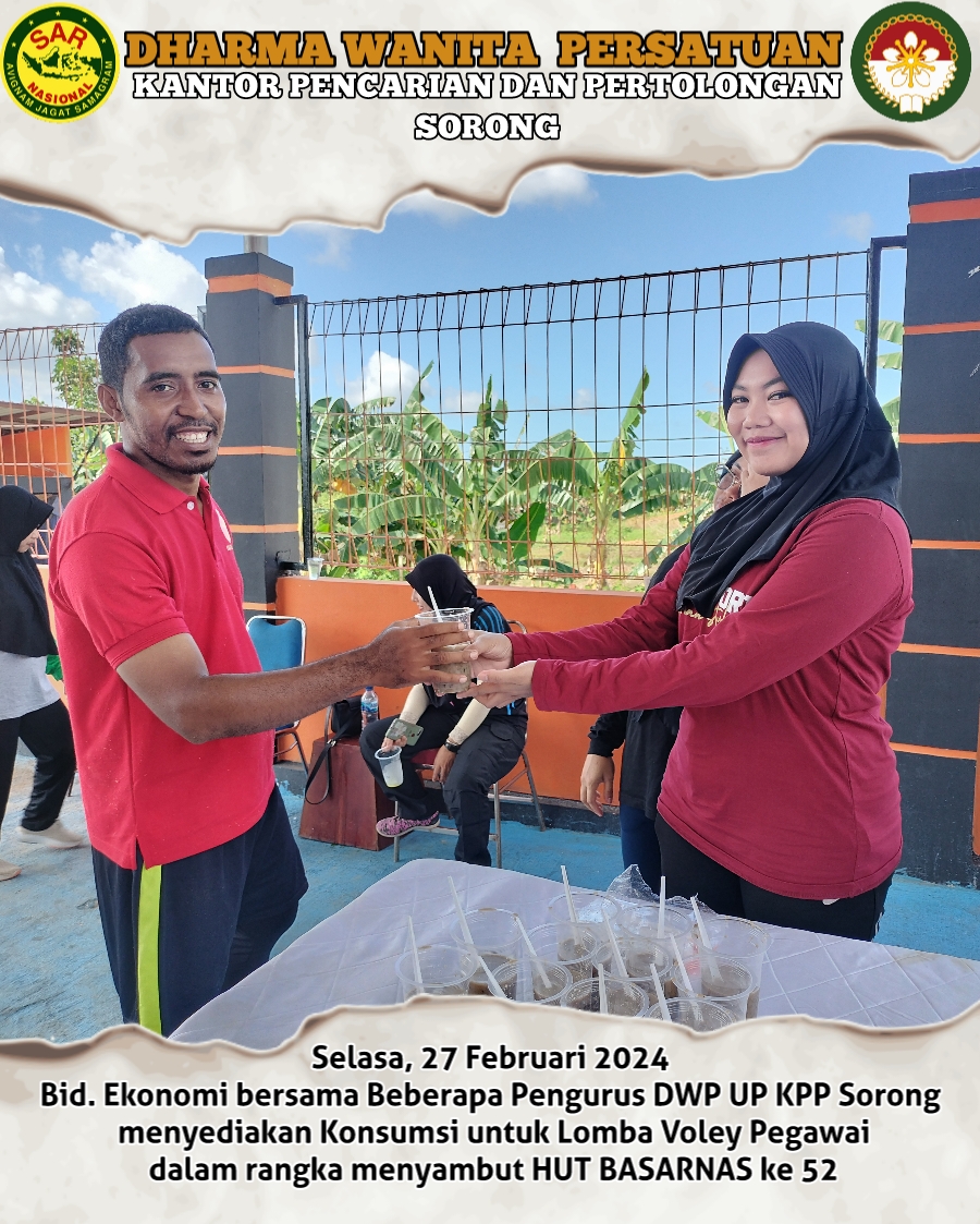 Selasa, 27 Februari 2024 Bid. Ekonomi dan beberapa pengurus Dharma Wanita Persatuan Unsur Pelaksana Kantor Pencarian dan Pertolongan Kelas A Sorong menyiapkan Konsumsi untuk Peserta Lomba Voley dalam Rangka menyambut HUT BASARNAS KE 52 Tahun.