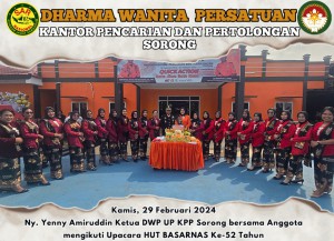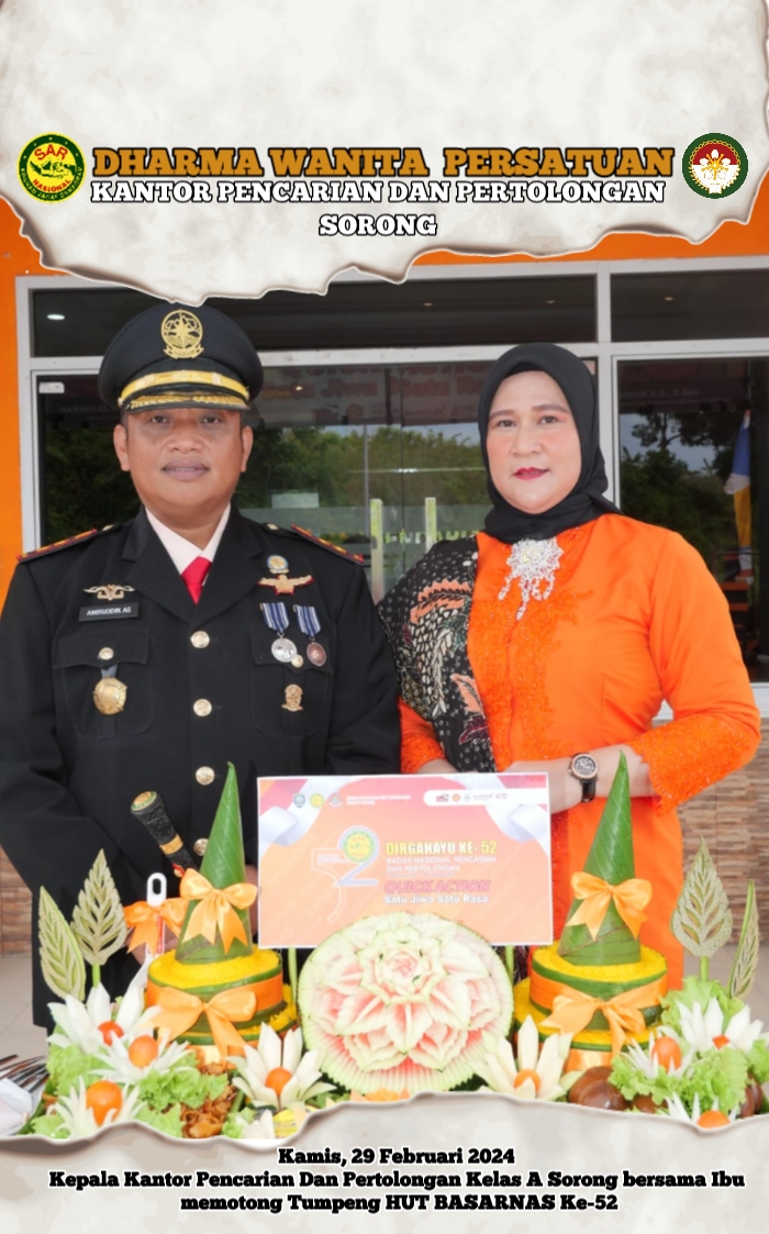 Kamis, 29 Februari 2024 Ny. Yenny Amiruddin Ketua Dharma Wanita Persatuan Unsur Pelaksana Kantor Pencarian dan Pertolongan Sorong bersama Anggota mengikuti Upacara Peringatan HUT Basarnas ke-52 yang diselenggarakan oleh Kantor Pencarian dan Pertolongan Sorong bertempat di halaman Kantor Pencarian dan Pertolongan Kelas A Sorong.Anggota yang mengikuti 21Anggota