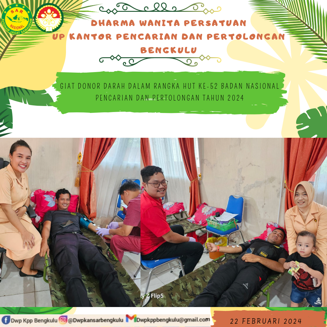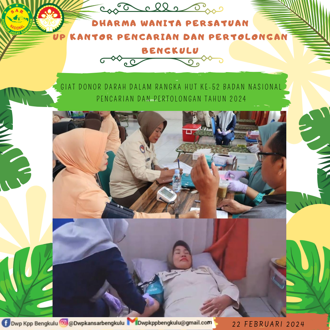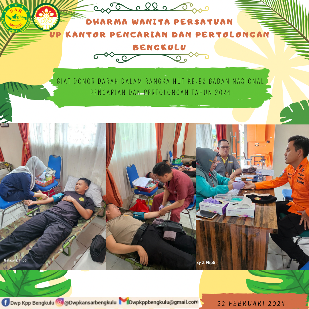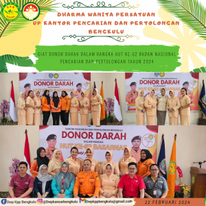 Kamis, 22 September 2024. Dharma Wanita Persatuan Unsur Pelaksana Kantor Pencarian dan Pertolongan Bengkulu mengikuti pelaksanaan Kegiatan Donor Darah sebagai Donor Darah Sukarela dalam rangka HUT BASARNAS Ke-52 di Kantor Pencarian dan Pertolongan Bengkulu