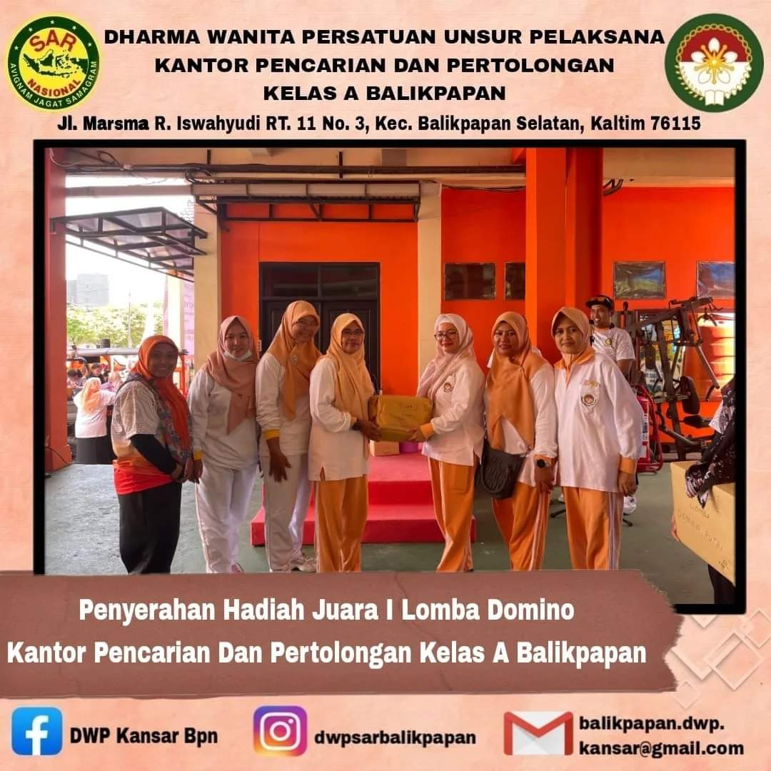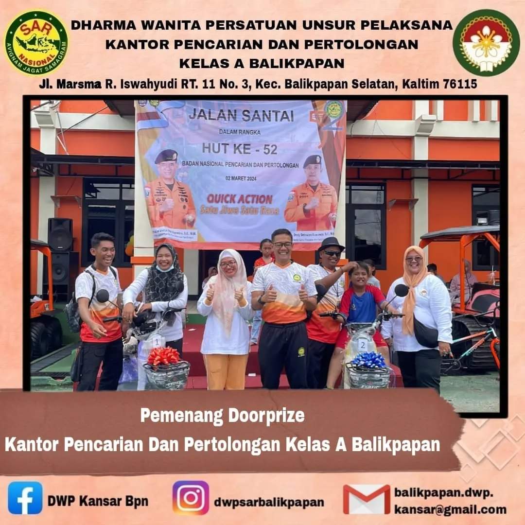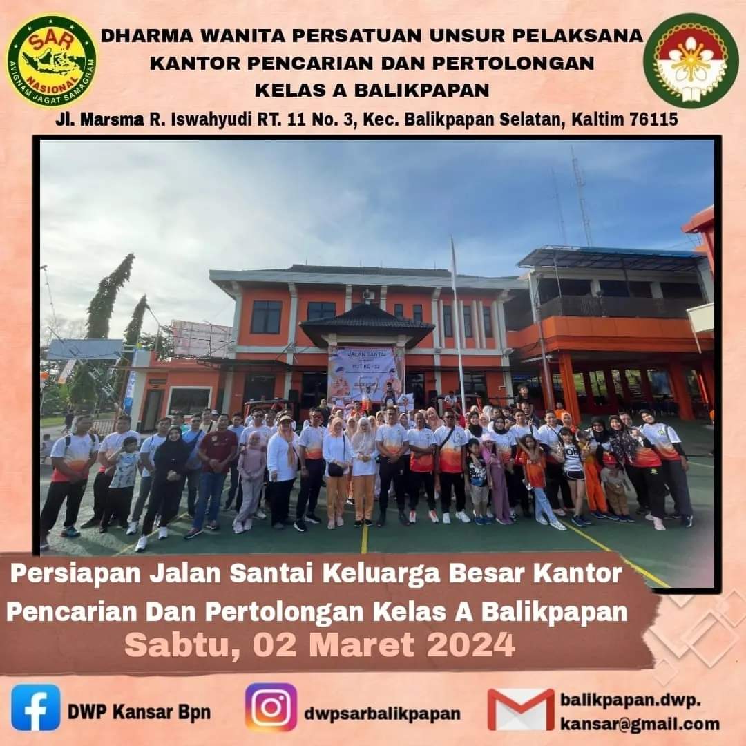 Sabtu, 2 Maret 2024 DWP UP Kantor Pencarian dan Pertolongan Balikpapan melaksanakan giat jalan santai yang diikuti seluruh keluarga besar Kantor Pencarian dan Pertolongan Balikpapan. Kegiatan diisi dengan jalan santai di sekitar lingkungan Kantor, pembagian hadiah pertandingan, games, dan pembagian door prize