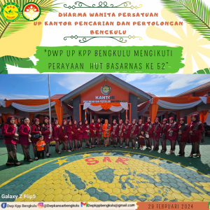 Kamis, 29 Februari 2024 pukul 08.00 wib, DWP UP KPP Bengkulu mengikuti perayaan HUT Basarnas ke 52 bertempat di Kantor Pencarian dan Pertolongan Bengkulu. Kegiatan diikuti Ketua DWP UP KPP Bengkulu Ny. Rosna Muslikun beserta pengurus dan anggota
