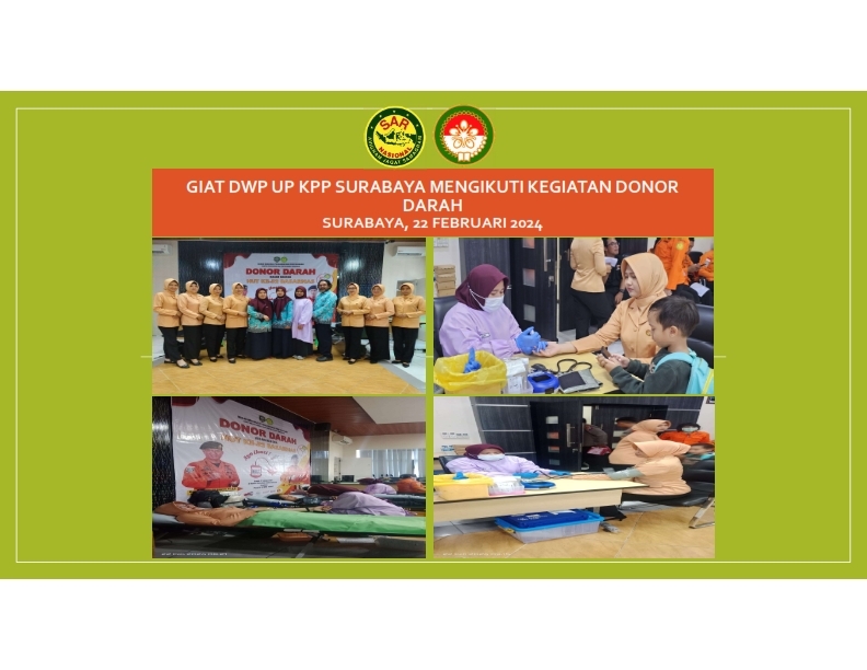 Surabaya, 22 Februari 2024 Wakil Ketua DWP UP KPP Surabaya Ny. Daniar Zaenal beserta pengurus mengikuti kegiatan donor darah di Kantor Pencarian dan Pertolongan Surabaya dalam rangkaian peringatan HUT Basarnas yang ke-52 tahun.