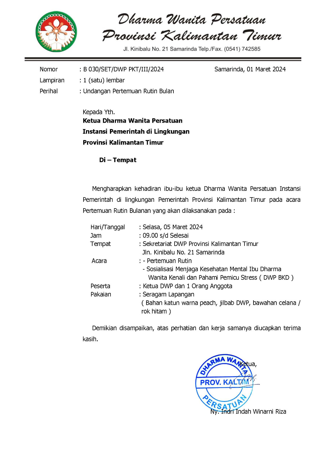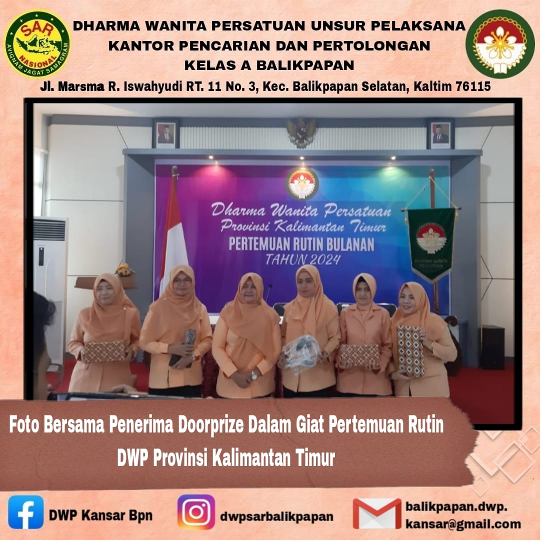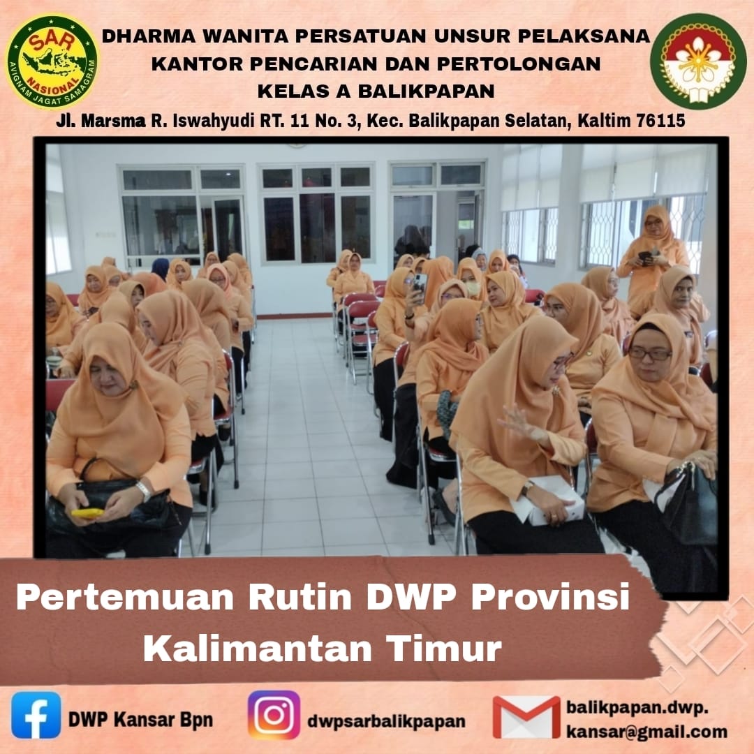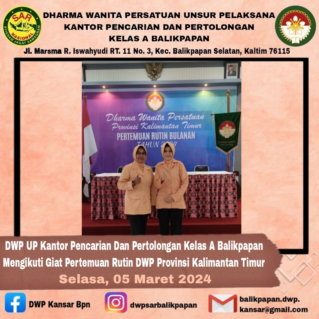 Selasa, 5 Maret 2024 perwakilan pengurus DWP UP Kantor Pencarian dan Pertolongan Balikpapan menghadiri Pertemuan Rutin Bulanan DWP Provinsi Kalimantan Timur yang diisi dengan kegiatan Sosialisasi Menjaga Kesehatan Mental Ibu DWP Dengan Memahami Pemicu Stress