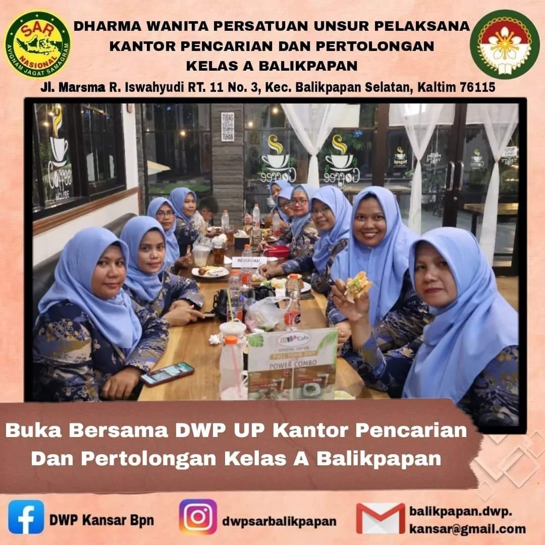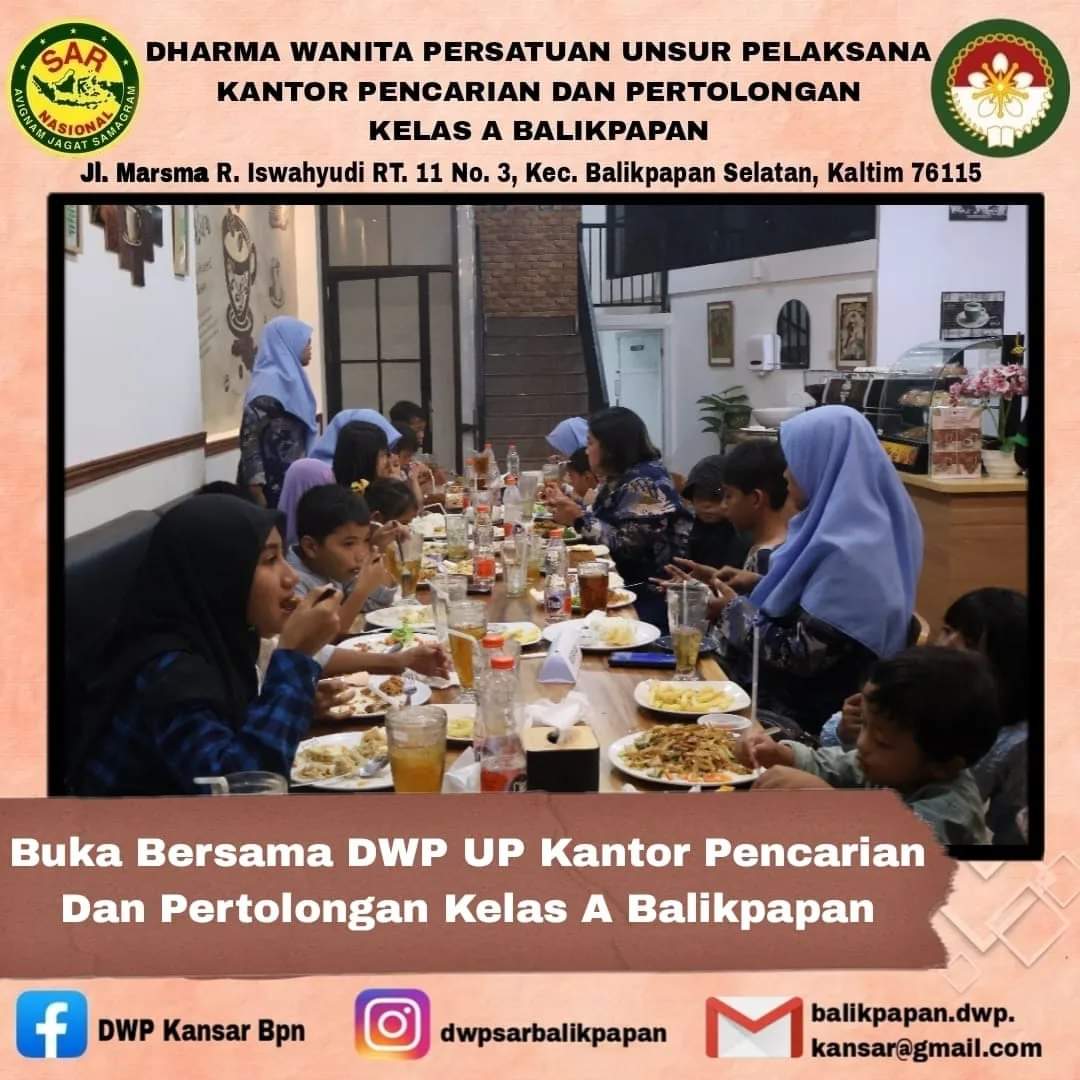 Rabu, 27 Maret 2024 DWP UP Kantor Pencarian dan Pertolongan Balikapapan melaksanakan buka puasa bersama. Hal ini dilakukan dalam rangka meningkatkan tali silaturahmi antara anggota.