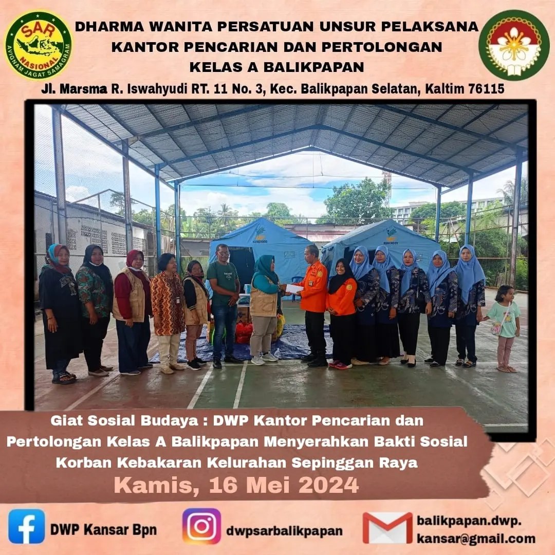 Kamis, 16 Mei 2024 Kepala Sub Bagian Umum dan anggota DWP UP Kantor Pencarian dan Pertolongan Kelas A Balikpapan menyerahkan bantuan hasil penggalangan dana dari pegawai Kantor Pencarian dan Pertolongan Kelas A Balikpapan dan anggota Kantor Pencarian dan Pertolongan Kelas A Balikpapan