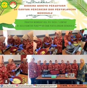 Senin, 6 Mei 2024 Ketua DWP UP KPP Bengkulu beserta pengurus dan anggota mengikuti giat praktek membuat kue pie susu / lontar di Aula Kantor Pencarian dan Pertolongan Bengkulu