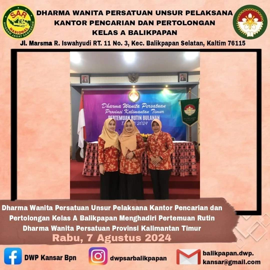 Rabu, 7 Agustus 2024 perwakilan anggota DWP Pos SAR Samarinda menghadiri pertemuan rutin DWP Provinsi Kalimantan Timur