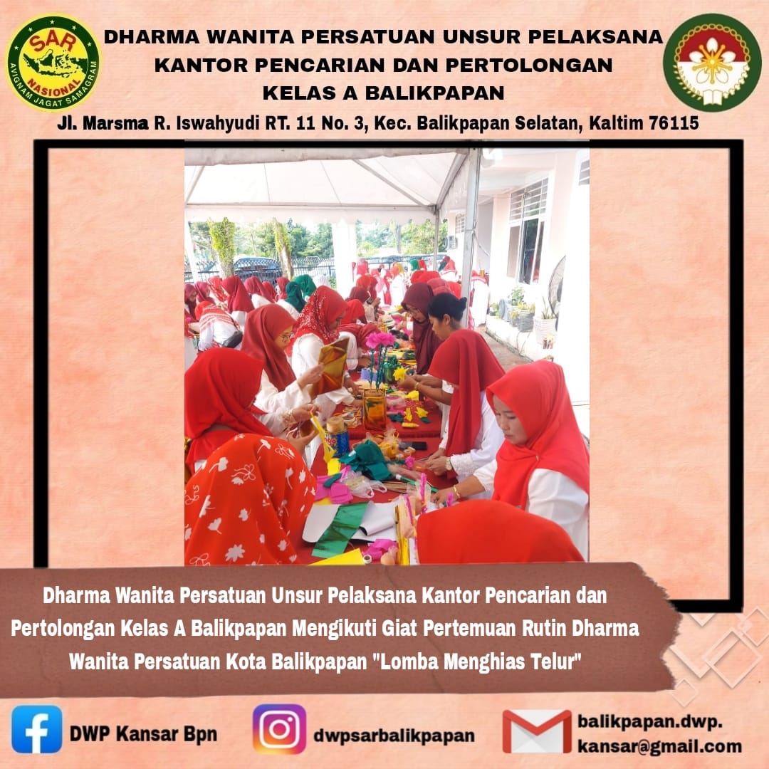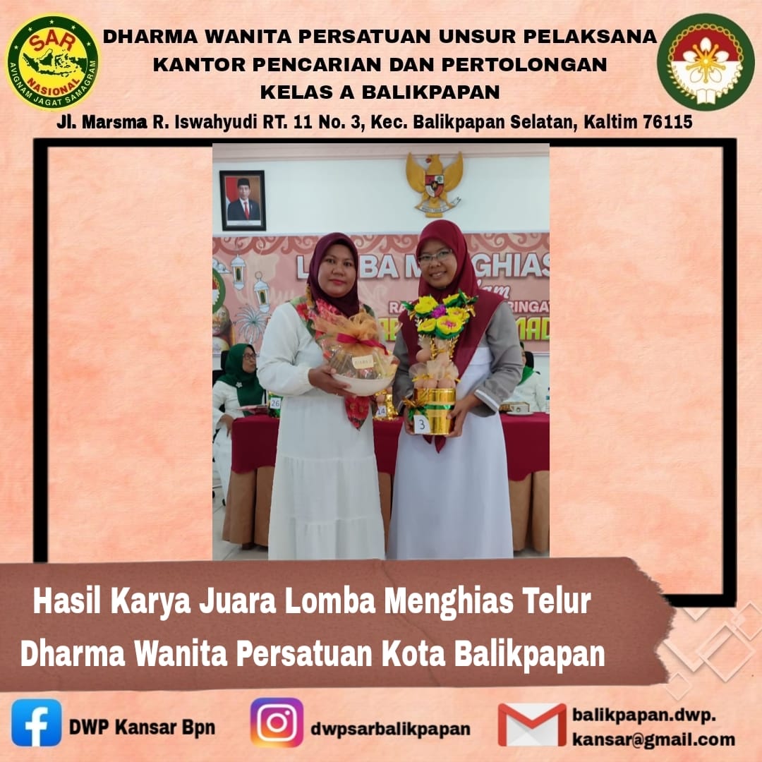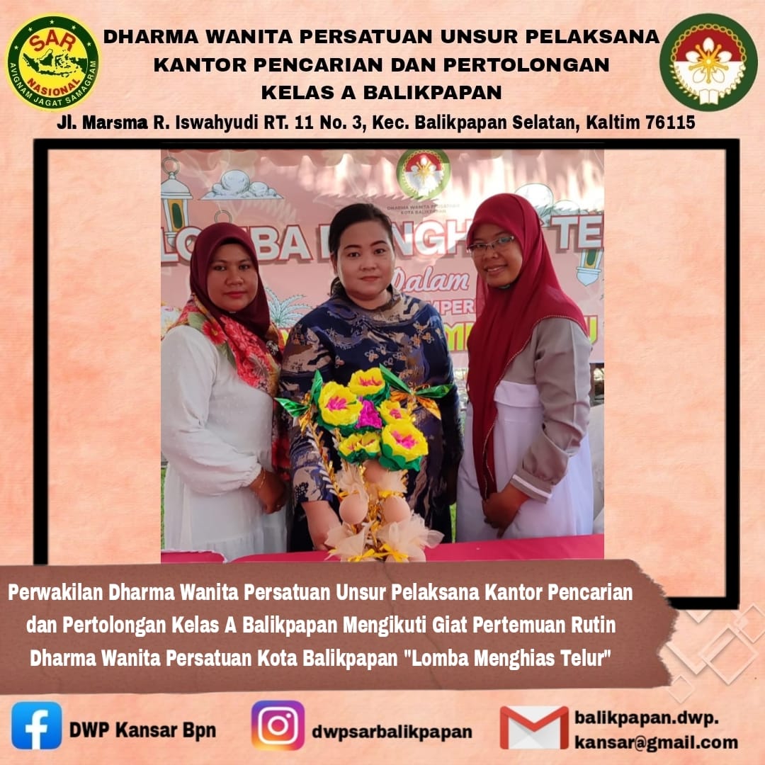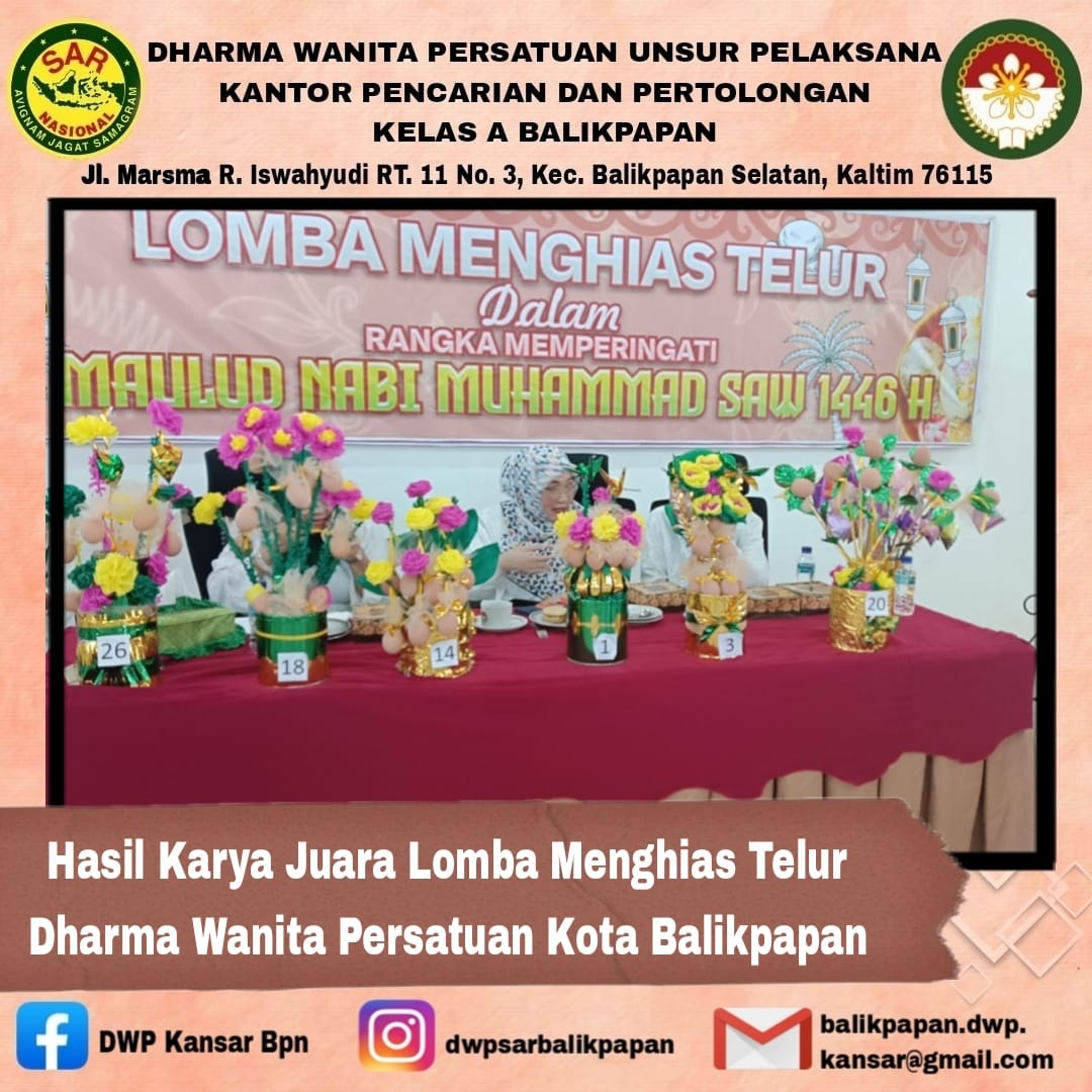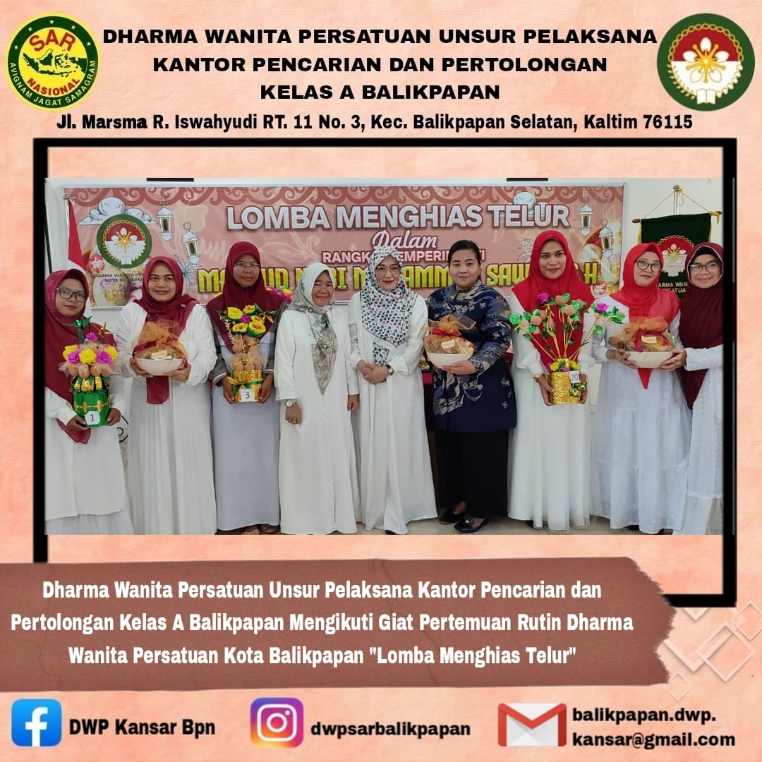 Jumat, 6 September 2024 DWP UP Kantor Pencarian dan Pertolongan Balikpapan mengikuti lomba menghias telur dalam rangka perayaan Maulid Nabi Muhammad SWT di DWP Kota Balikpapan dan mendapatkan juara 2