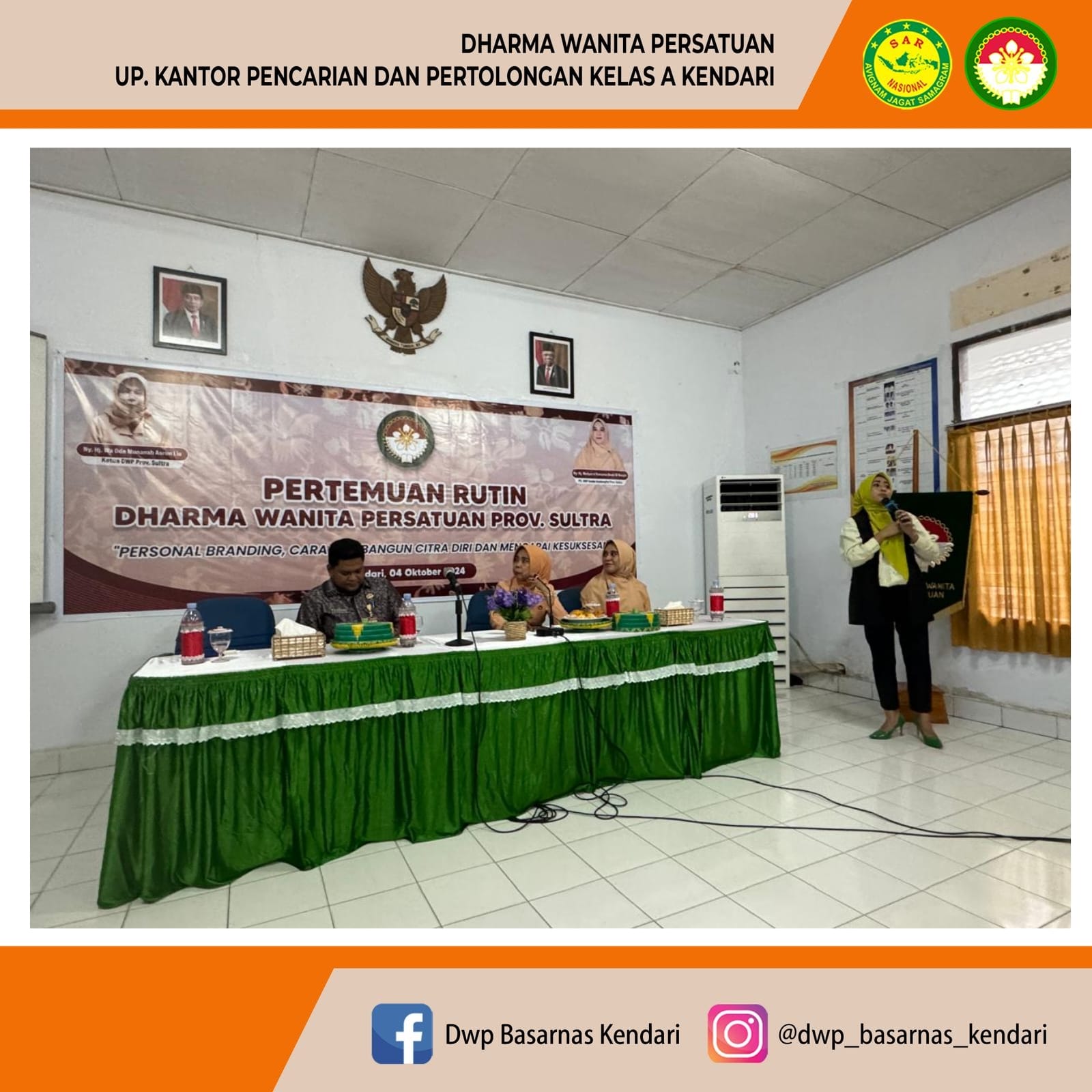 DWP UP Kantor Pencarian dan Pertolongan kendari menghadiri undangan pertemuan rutin DWP Provinsi Sulawesi Tenggara yang berlangsung di aula Kesbangpol. Pertemuan rutin ini di isi dengan materi "Personal Branding, Cara Membangun Citra Diri dan Mencapai Kesuksesan". Materi di sampaikan oleh Ibu Reny Emilda Susana I,T. Sos, MM sebagai Ketua Yayasan Padma Resita Sulawesi Tenggara.