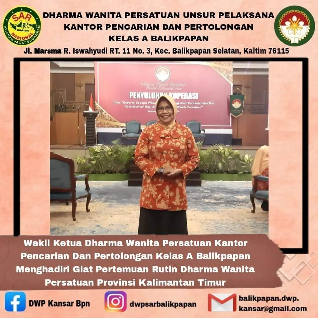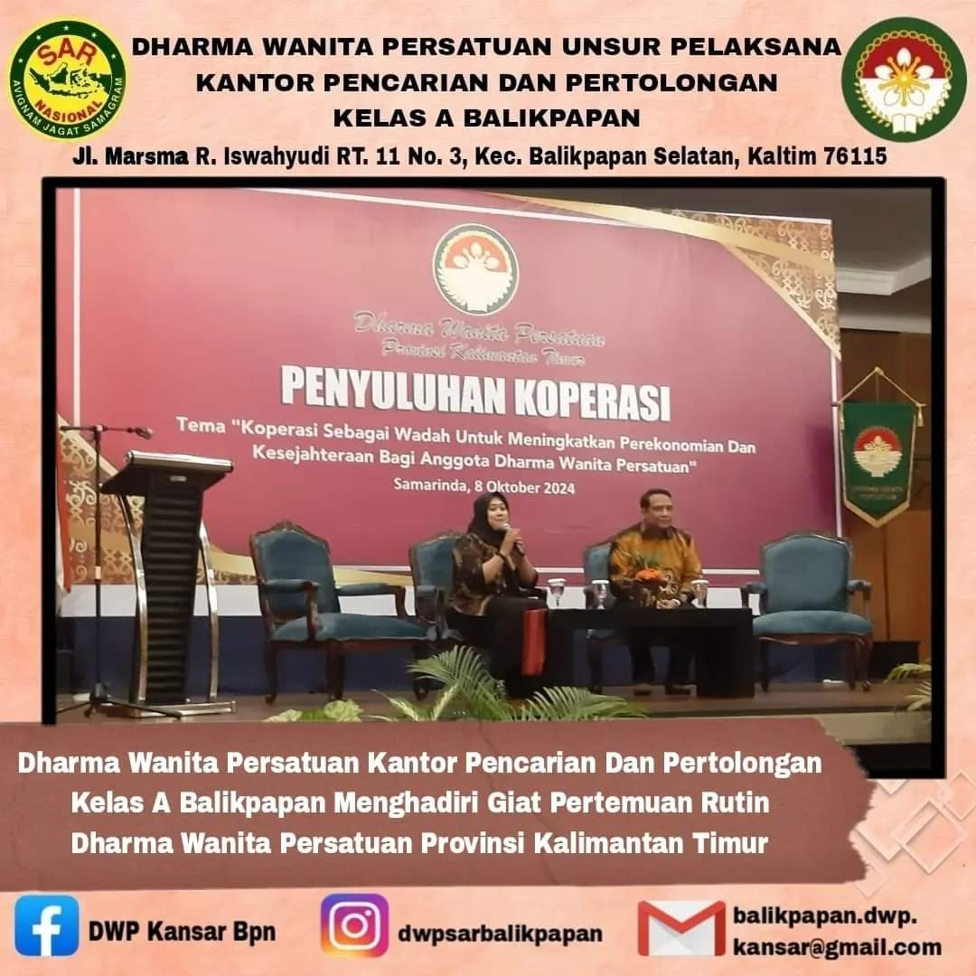 Rabu, 9 Oktober 2024 Wakil Ketua DWP UP Kantor Pencarian dan Pertolongan Kelas A Balikpapan menghadiri pertemuan rutin DWP Provinsi Kalimantan Timur yang diisi dengan kegiatan Penyuluhan Koperasi