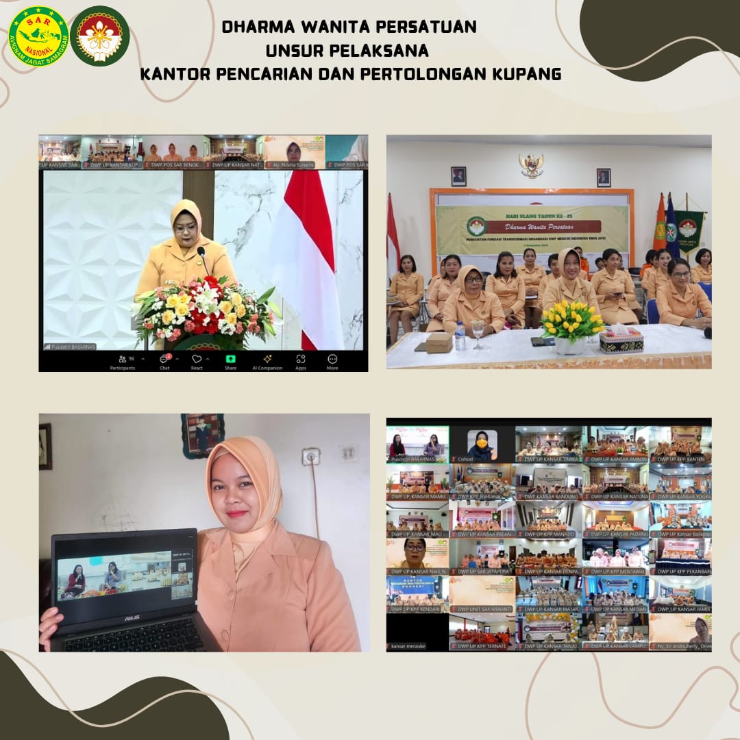 Selasa, 10 Desember 2024. Ketua DWP UP KPP Kupang Ny. Anni Nanang Sigit bersama pengurus anggota DWP UP KPP Kupang dan Unit Siaga SAR mengikuti peringatan HUT DWP ke 25 bersama DWP Basarnas melalui zoom meeting bertempat di Aula KPP Kupang. Dalam arahan Ketua DWP Basarnas, Ibu Ika Kusworo menekankan kepada seluruh Ketua DWP UP dan anggota untuk tetap berbuat kebaikan baik itu kepada keluarga, organisasi dan masyarakat. Karena sesungguhnya berbuat kebaikan itu adalah untuk kita sendiri karena dengan berbuat kebaikan maka kebaikan itu juga akan kembali kepada kita sendiri. Peringatan HUT DWP ke 25 kali ini diisi dengan edukasi atau literasi keuangan dengan mengundang nara sumber dari Bank Mandiri yaitu ibu Rieka Adhityarti. Harapannya dengan materi ini anggota dapat merencanakan keuangan rumah tangga dan membantu penghasilan keluarga menjadi lebih stabil, lebih terarah dan menjamin masa depan lebih baik. Produk yang ditawarkan yaitu sukuk atau saham yang dapat diperjualbelikan bagi masyarakat.