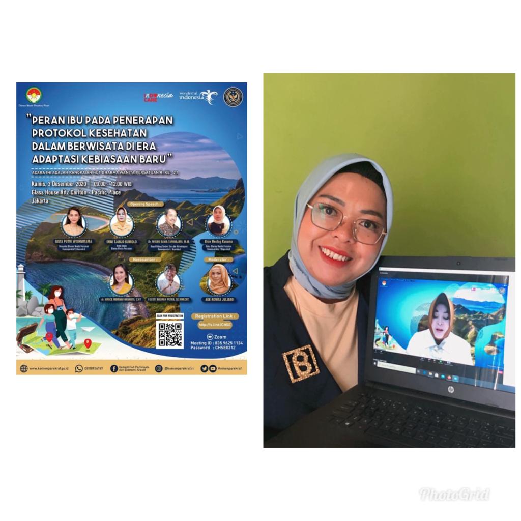 Pada hari Kamis, tanggal 03 Desember 2020, Ketua DWP UP Kantor Pencarian dan Pertolongan Mentawai Ny. Vivie Akmal mengikuti Webinar dengan tema "Peran Ibu Pada Penerapan Protokol Kesehatan Dalam Berwisata Di Era Adaptasi Kebiasaan Baru" melalui aplikasi Zoom Meeting.