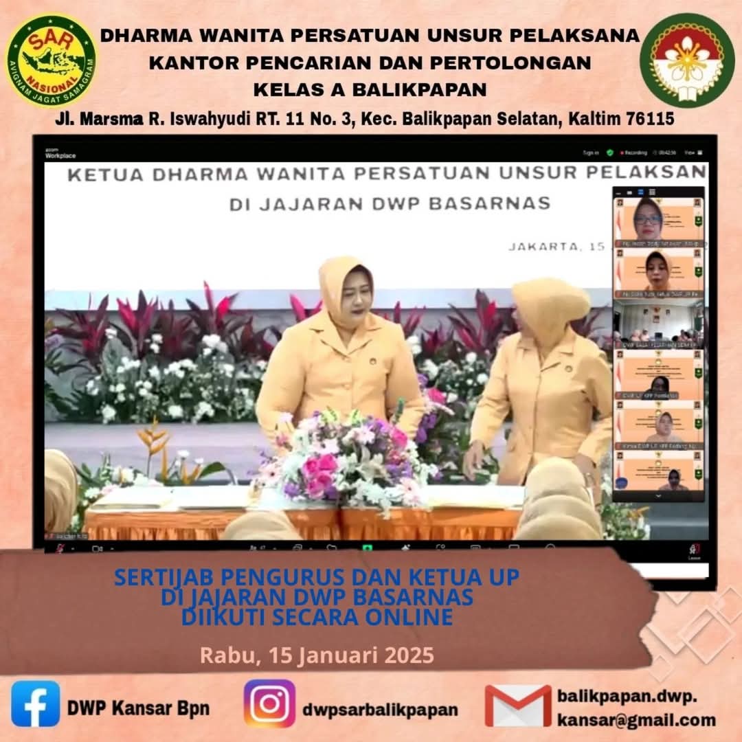 Rabu, 15 Januari 2025 Ketua DWP UP Kantor Pencarian dan Pertolongan Kelas A Balikpapan mengikuti serah terima jabatan Pengurus Dharma Wanita Persatuan dan Ketua Dharma Wanita Persatuan Unsur Pelaksana Kantor di lingkungan Badan Nasional Pencarian dan Pertolongan