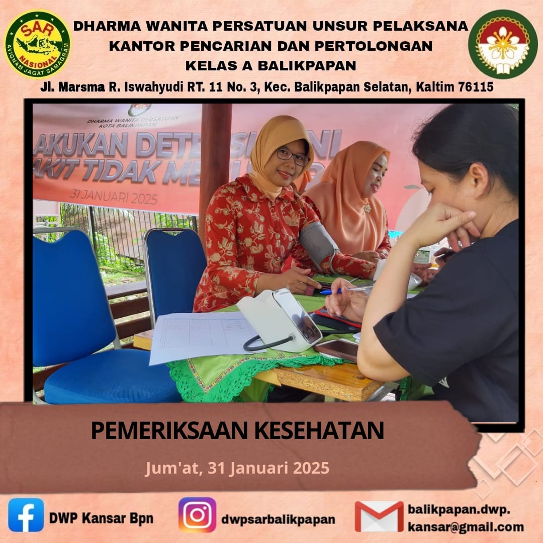Jumat, 31 Januari 2025 DWP UP Kantor Pencarian dan Pertolongan Kelas A Balikpapan menghadiri pertemuan rutin DWP Kota Balikpapan bulan Januari yg diisi dengan kegiatan pemeriksaan kesehatan, sosialisasi program kerja tahun 2025, sosialisasi penyimpanan bahan pangan asal hewan