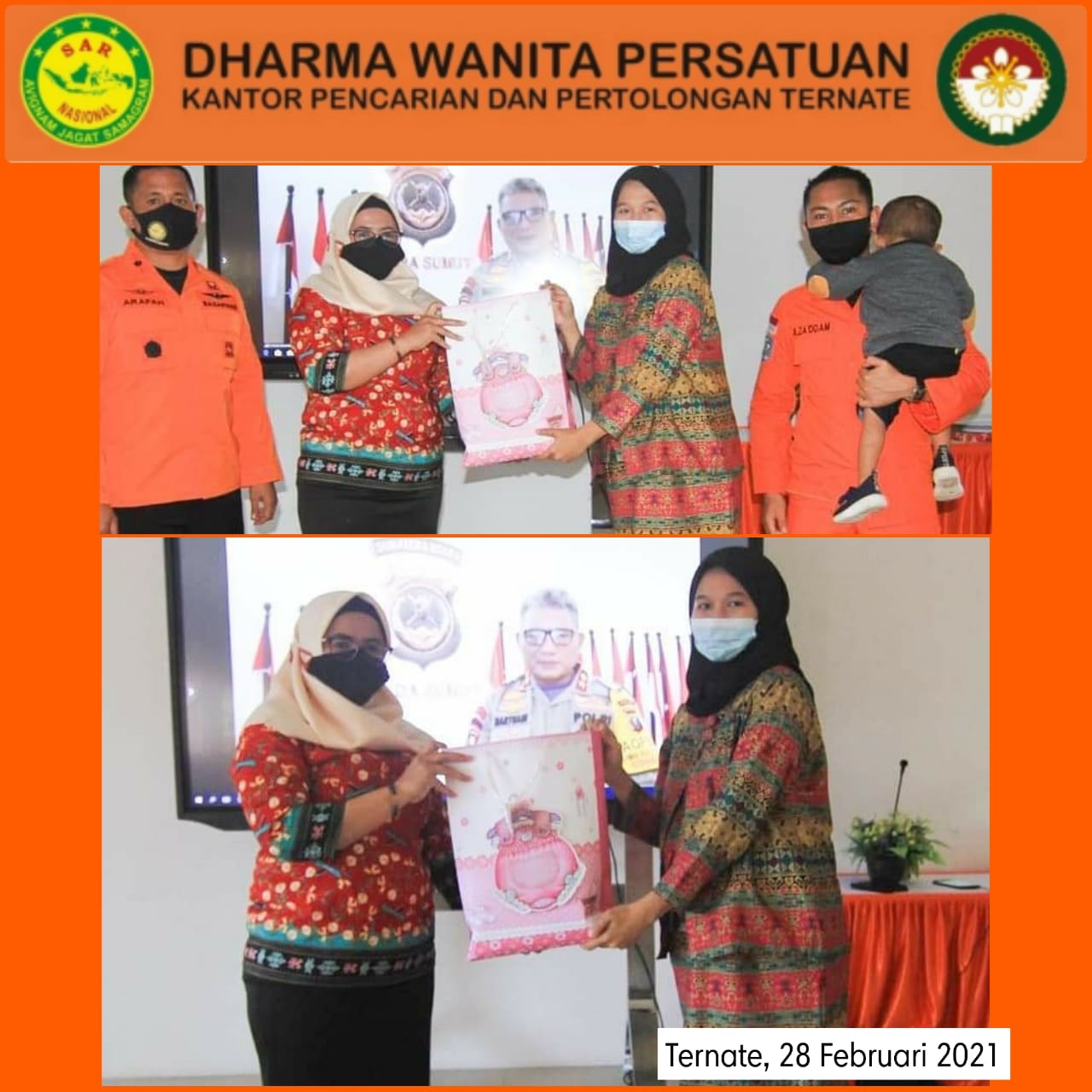 Pada tanggal 28 Februari 2021 Ketua DWP UP Kantor Pencarian dan Pertolongan Ternate (Ny.Mariyam Arafah) melakukan penyerahan Atribut DWP kepada 3 Anggota baru DWP UP Kantor Pencarian dan Pertolongan Ternate.