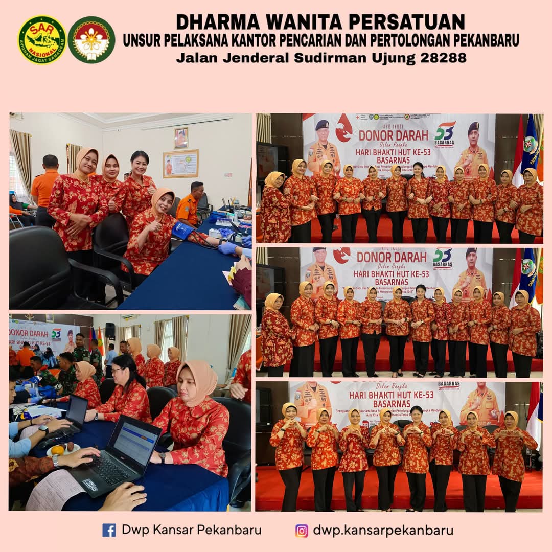Senin, 03 Februari 2025 Ketua Dharma Wanita Persatuan Unsur Pelaksana Kantor Pencarian dan Pertolongan Pekanbaru, Ny. Siska Budi Cahyadi bersama pengurus dan anggota mengikuti giat Donor Darah dalam rangka Hari Bhakti HUT ke-53 Badan Nasional Pencarian dan Pertolongan (Basarnas) tahun 2025 yang bertema "Penguatan Satu Jiwa Satu Rasa Pencarian dan Pertolongan Dalam Rangka Mendukung Asta Cita Menuju Indonesia Emas 2045" Dilaksanakan di Kantor Pencarian dan Pertolongan Pekanbaru